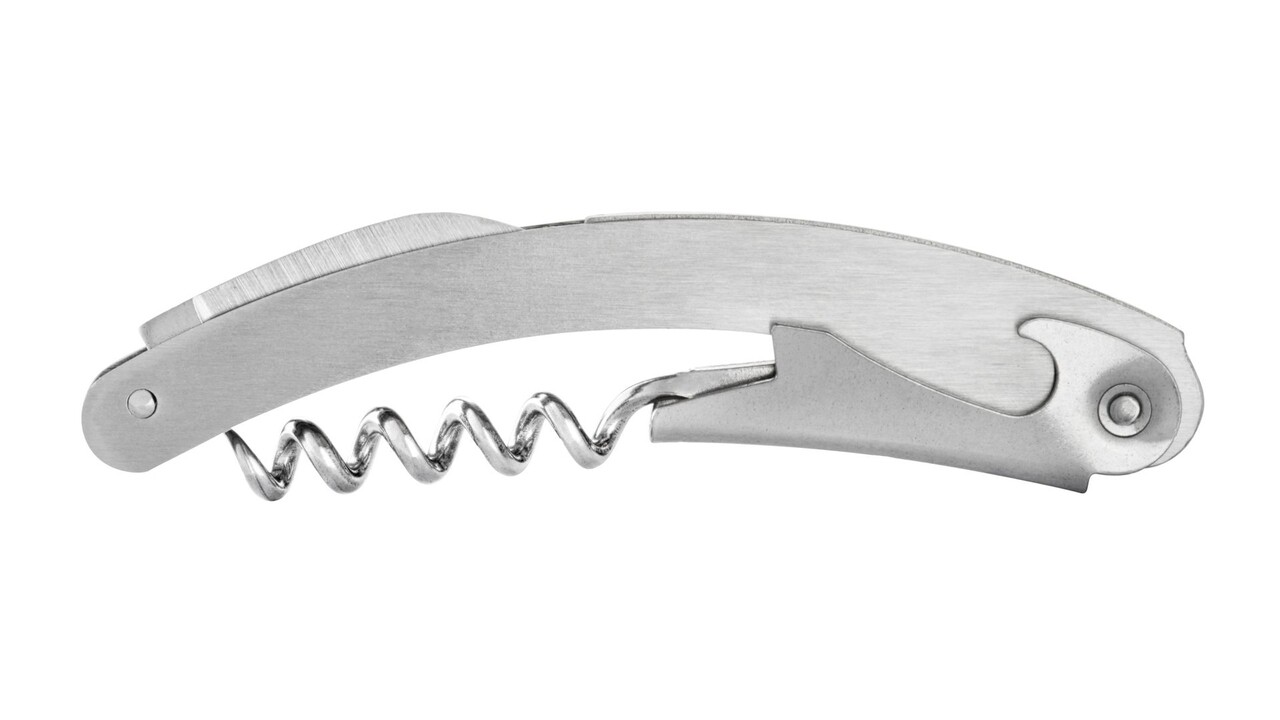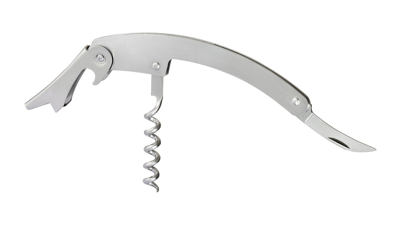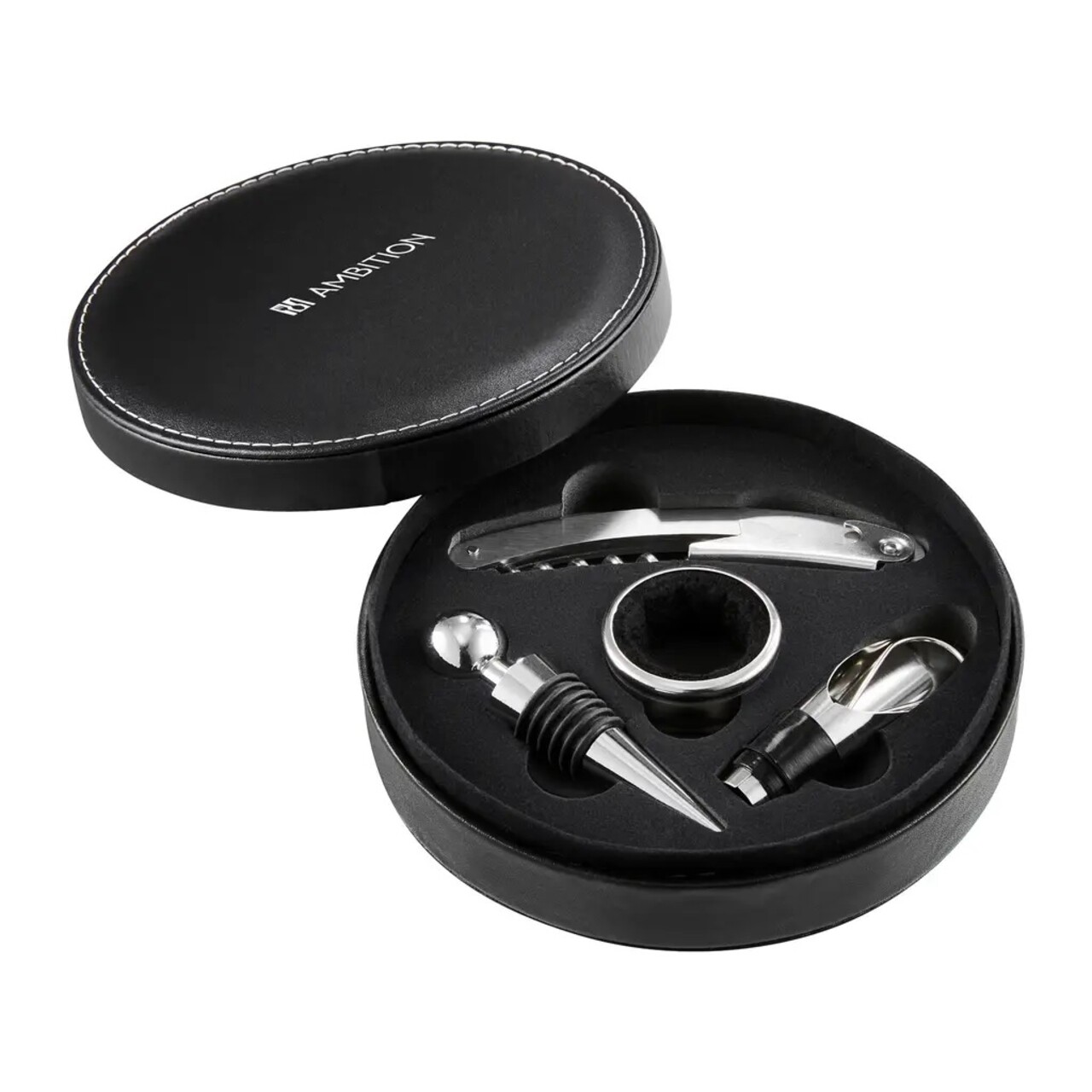 Setul de 4 accesorii pentru vin ambalat in cutie eleganta din piele este un cadou potrivit pentru toti iubitorii de vin. Setul contine: tirbuson cu lama, dop, inel antipicurare si dozator. Dimensiuni: 14.5x4.5 cm.