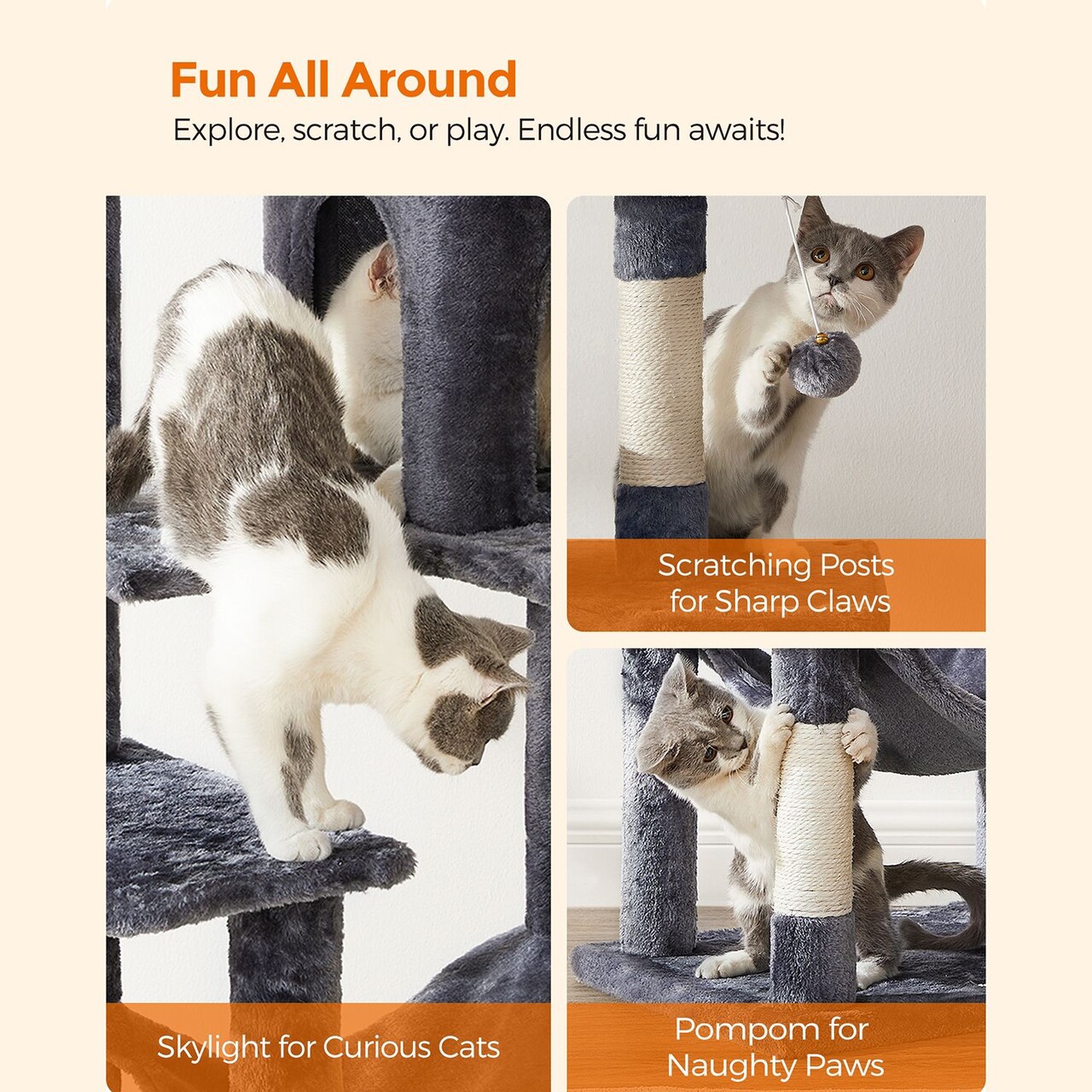 2 perne si 1 pestera Acest copac pentru pisici are doua perne in partea de sus si o pestera confortabila pentru pisici, oferind mai multe locuri comode pentru ca pisicile sa se relaxeze si sa observe - perfect pentru locuintele cu mai multe pisici. De asemenea, include un hamac de relaxare si pompoane cu clopotei pentru divertismentul pisicilor. Sunt incluse si doua pompoane fara clopotei.