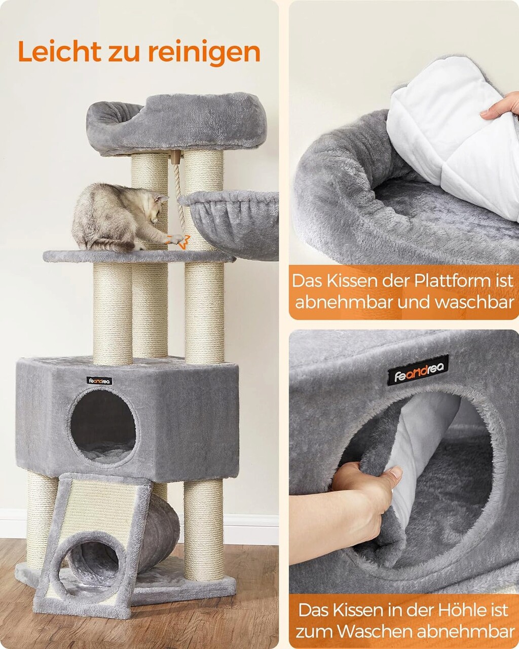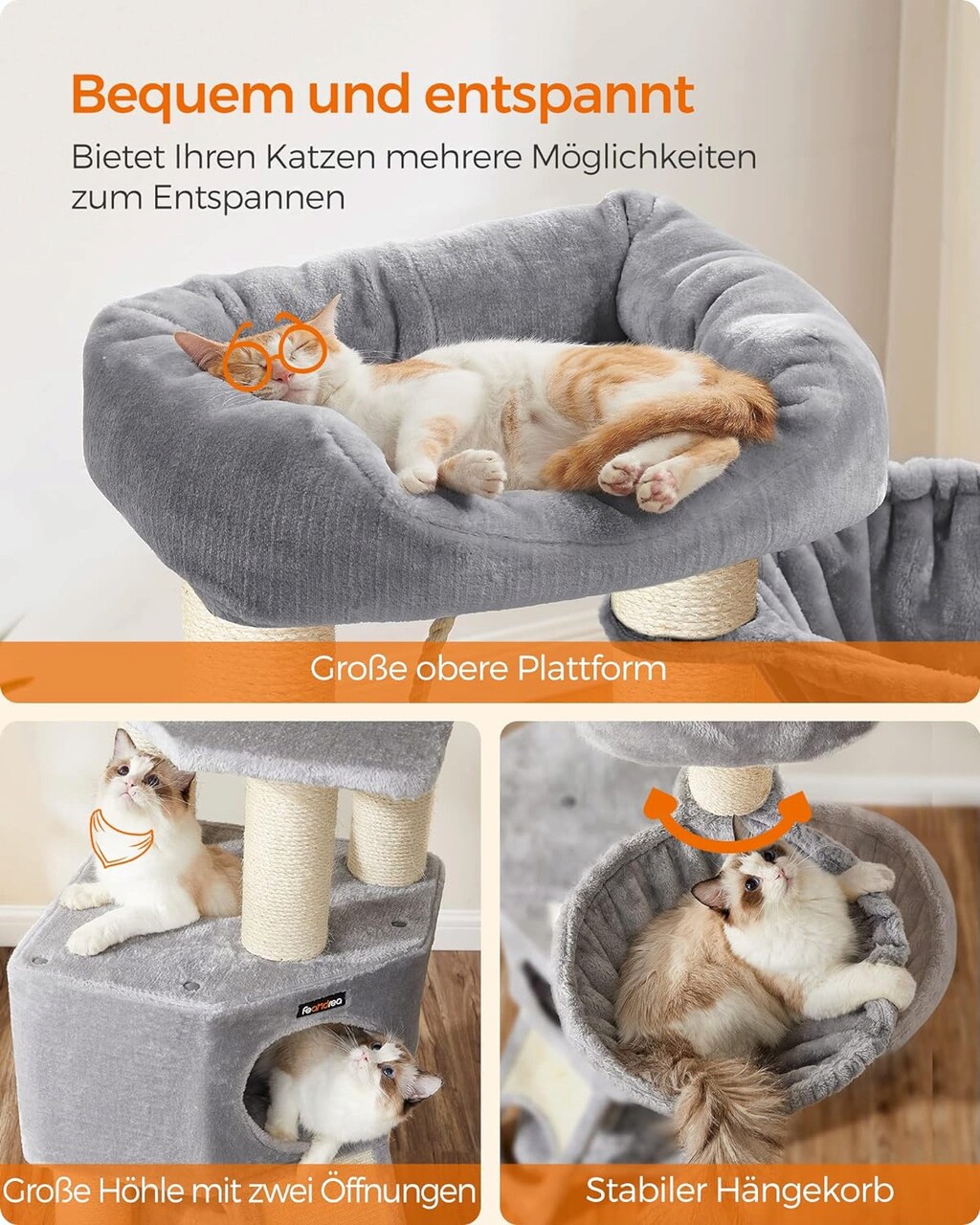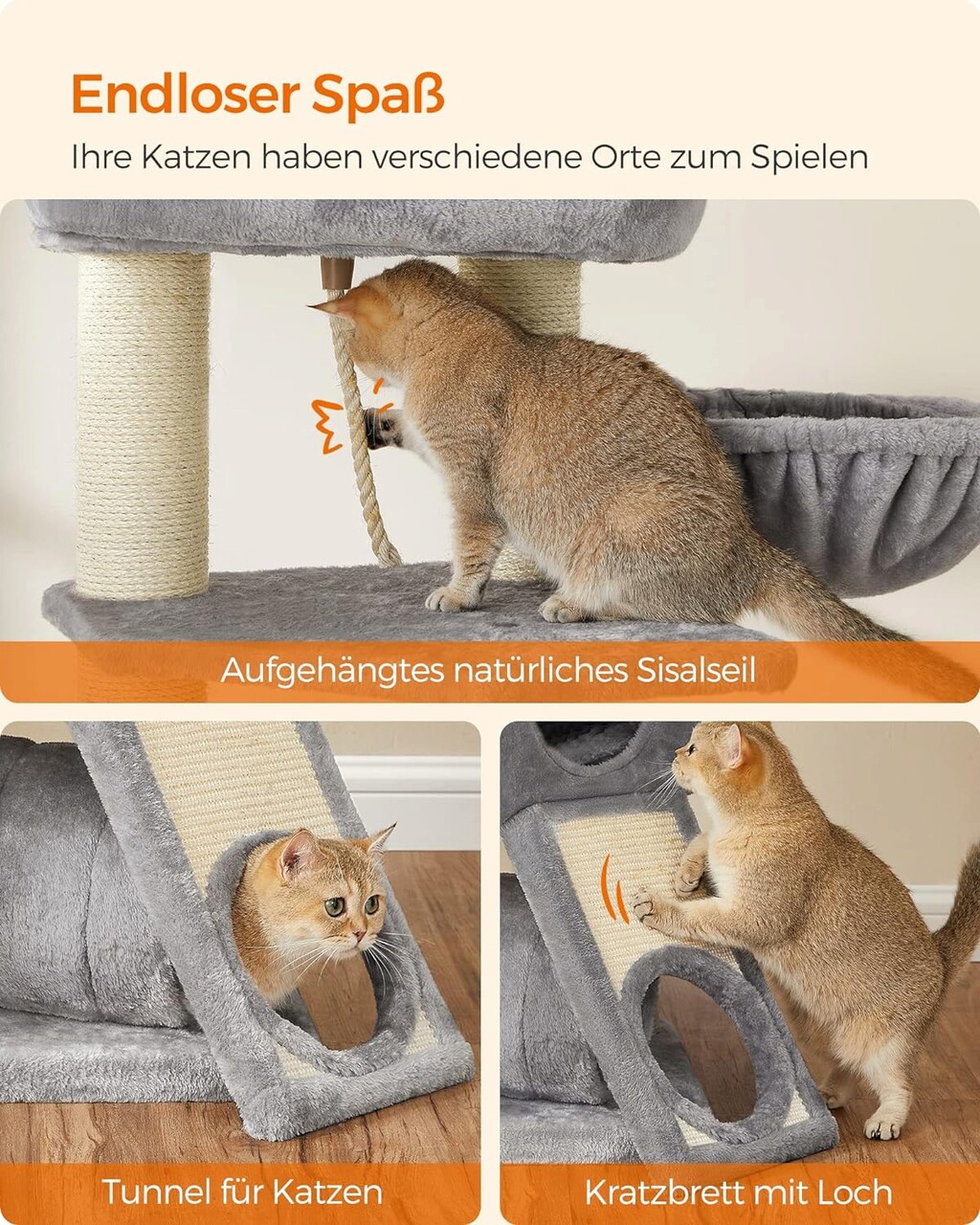 Distractie fara sfarsit Un tunel pentru pisici, o placa de zgariat cu orificiu, mai multi stalpi din sisal, o sfoara de sisal agatata, un hamac si o platforma - Acest arbore pentru pisici este versatil, are mult spatiu si ofera distractie fara sfarsit pentru prietenii dvs. blanosi.