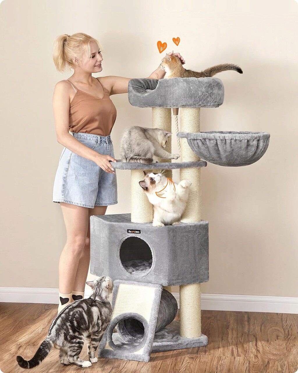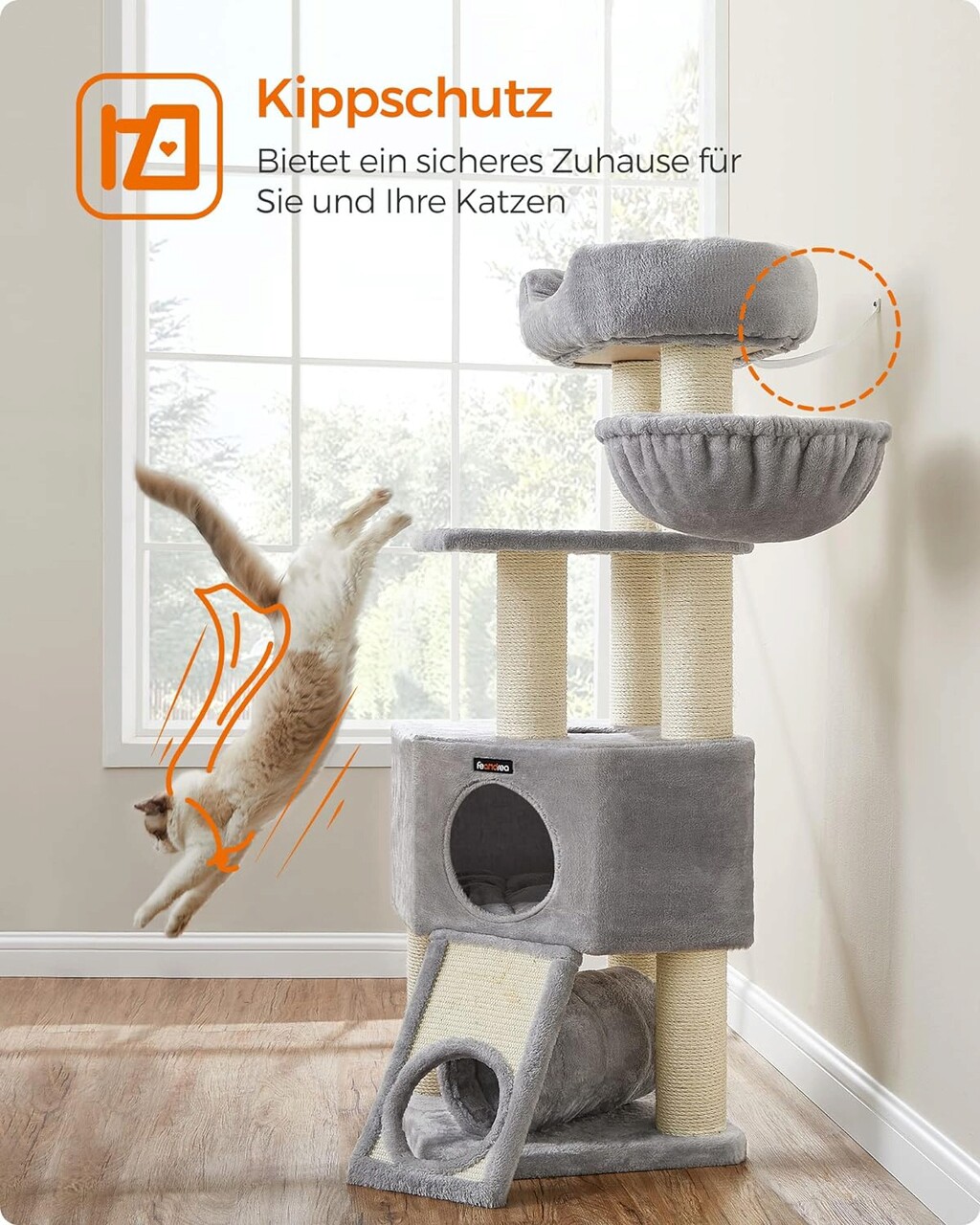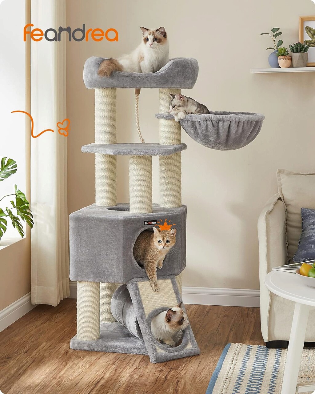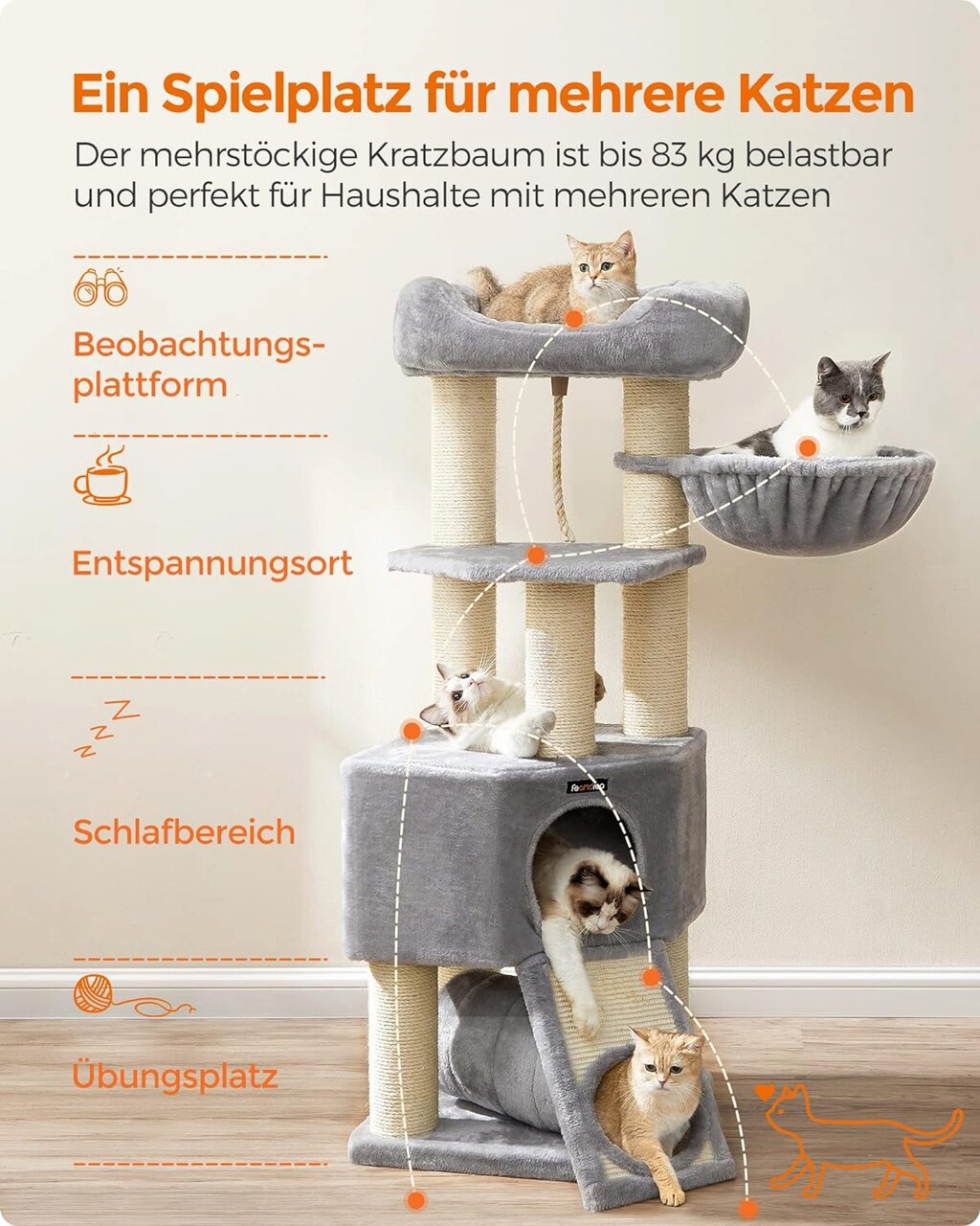 Distractie fara sfarsit Un tunel pentru pisici, o placa de zgariat cu orificiu, mai multi stalpi din sisal, o sfoara de sisal agatata, un hamac si o platforma - Acest arbore pentru pisici este versatil, are mult spatiu si ofera distractie fara sfarsit pentru prietenii dvs. blanosi.