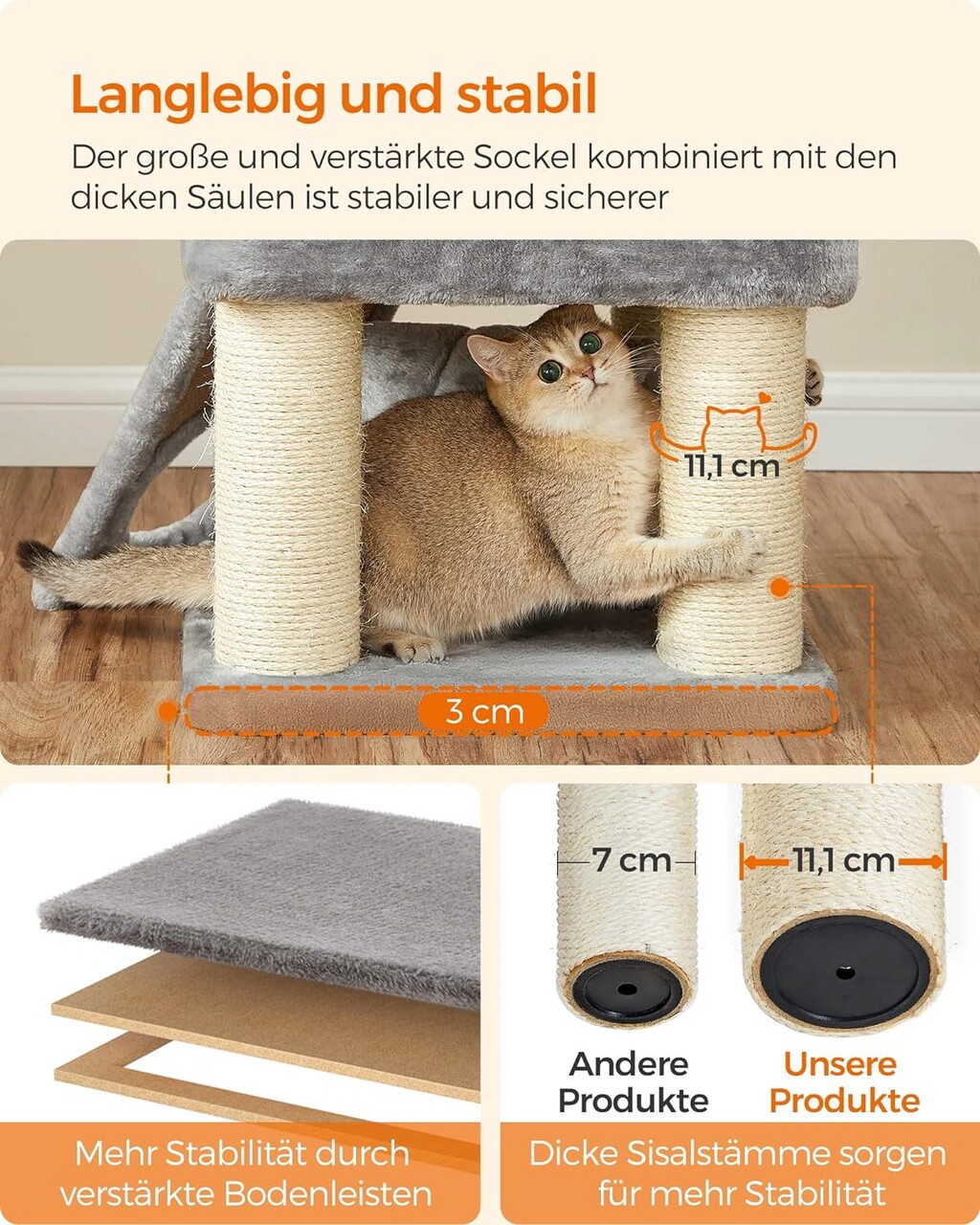Durabil si stabil Datorita bazei mari (50 x 50 cm), a stalpilor grosi (diametru de 11,5 cm) si a lamelelor din lemn, acest mobilier pentru pisici ofera o stabilitate ridicata pentru sarituri, iar protectia la inclinare inclusa asigura o siguranta suplimentara.