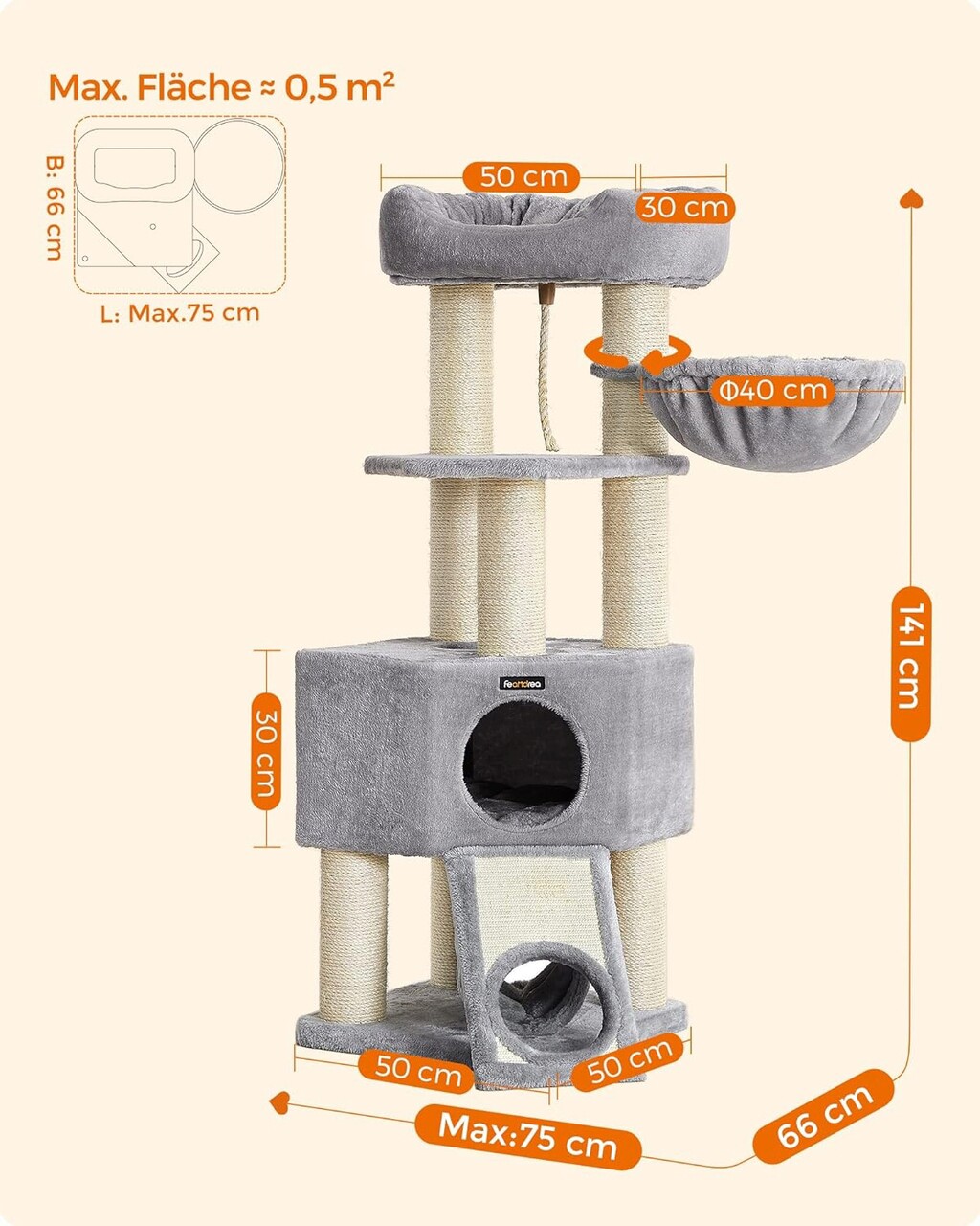 Potrivita pentru pana la 5 pisici Acest suport de zgariat pe mai multe niveluri poate sustine pana la 83 kg in total si este potrivit pentru mai multe pisici. Pe platforma pentru observare, in hamac pentru relaxare sau pe stalpii din sisal si pe placa de zgariat pentru ascutirea ghearelor.