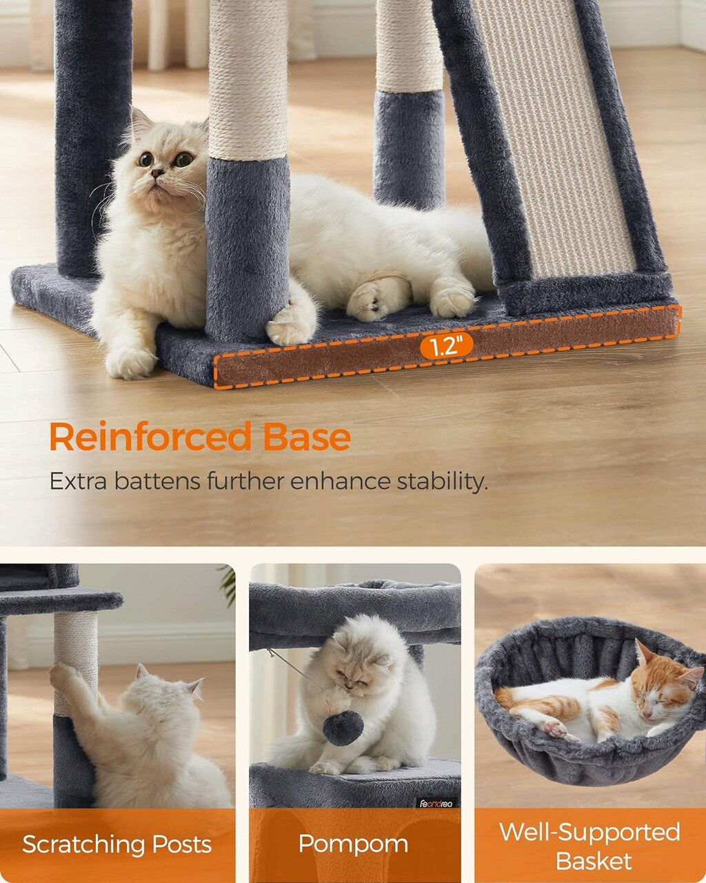 Ansamblul pentru pisici cu stalp pentru zgariat Feandrea ofera un loc de joaca sigur pentru pana la 3 pisici (max. 7 kg fiecare).