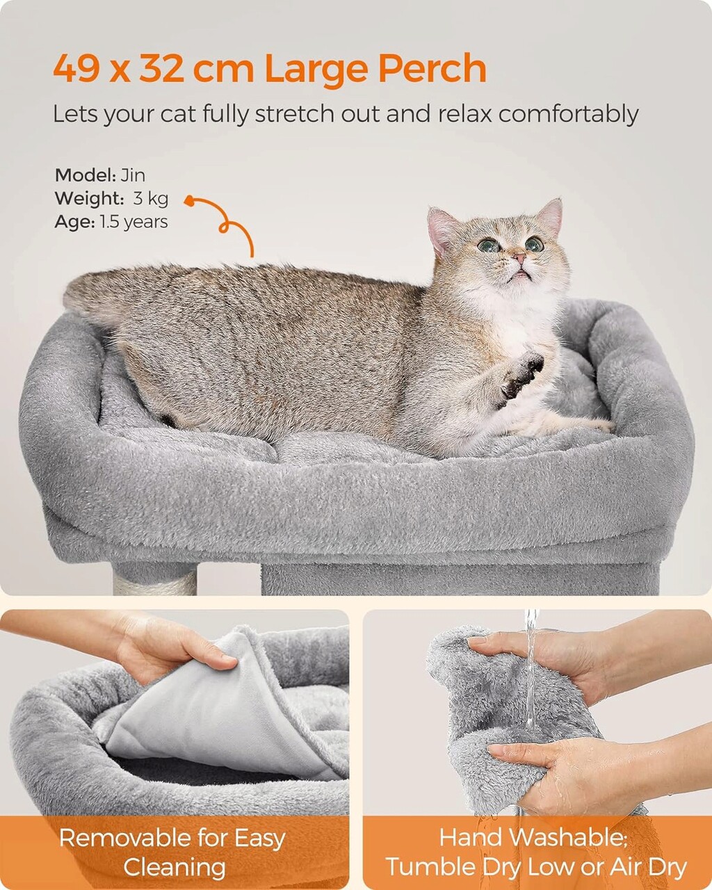 Pervaz de dimensiuni mari Acest arbore mic pentru pisici are un pervaz mare de 49 x 32 cm, cu margini ridicate si bine captusite, care ofera un spatiu incapator pentru ca pisoiul tau sa se intinda complet si sa se relaxeze confortabil.