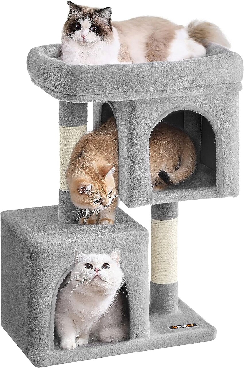 2 pesteri pentru pisici Pestera superioara cu 2 intrari ofera o priveliste vasta si acces usor. Pestera inferioara cu o singura usa este o ascunzatoare linistita pentru somnorosii care pot trage un pui de somn si este, de asemenea, excelenta pentru pisicutele care inca se obisnuiesc sa sara.