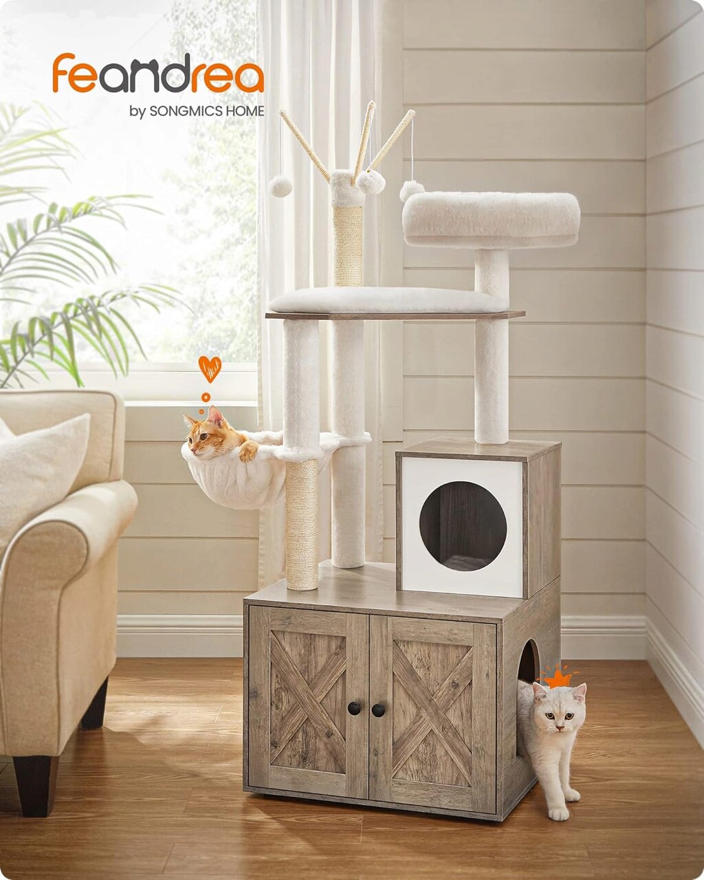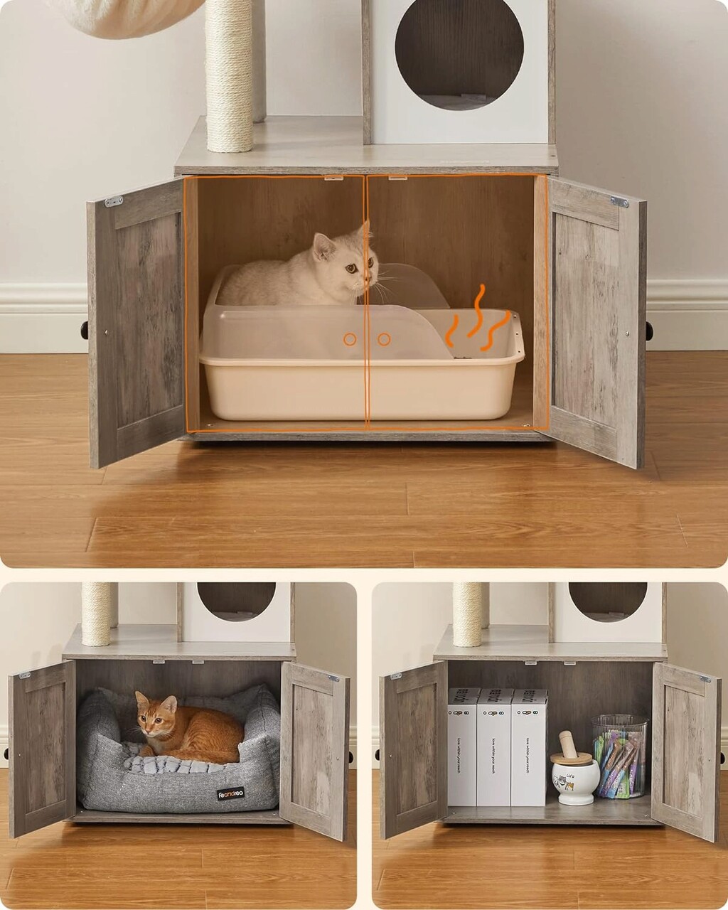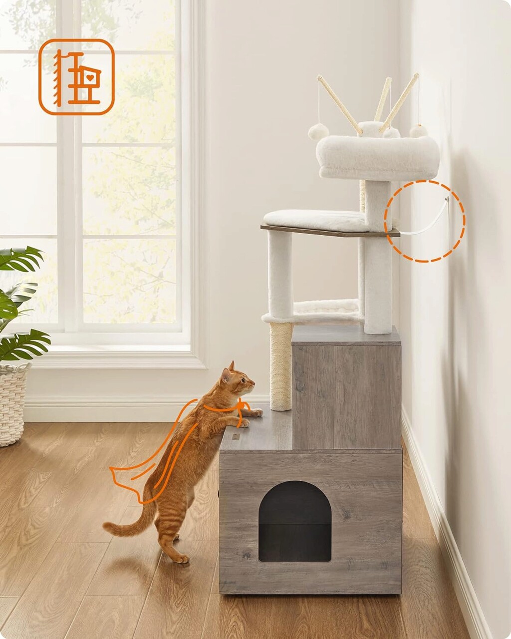 Mobilier pentru pisici 2 in 1: combinatia dintre arborele pentru pisici si litiera ofera pisicii dvs. un loc pentru a privi, a se juca, a se relaxa si a-si face nevoile, in acelasi timp ocupand putin spatiu.