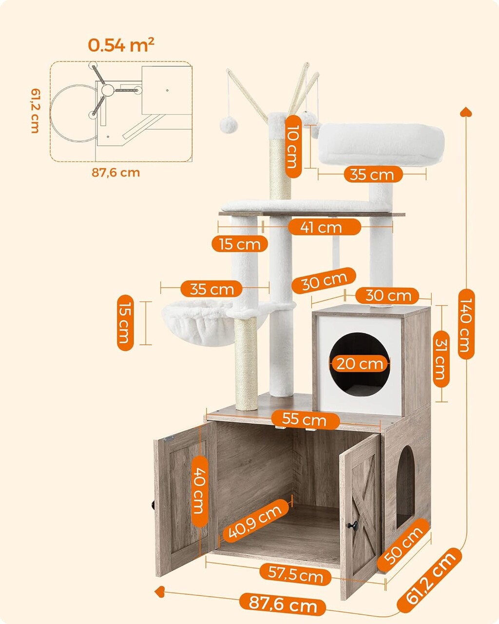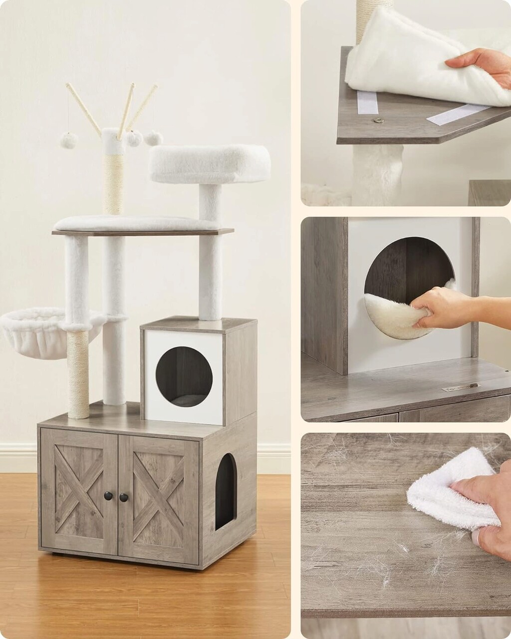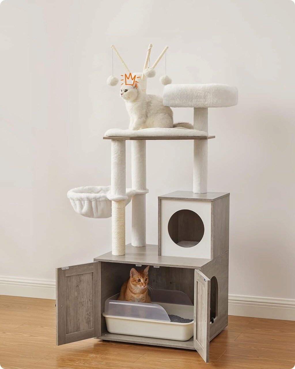 Mobilier pentru pisici 2 in 1: combinatia dintre arborele pentru pisici si litiera ofera pisicii dvs. un loc pentru a privi, a se juca, a se relaxa si a-si face nevoile, in acelasi timp ocupand putin spatiu.