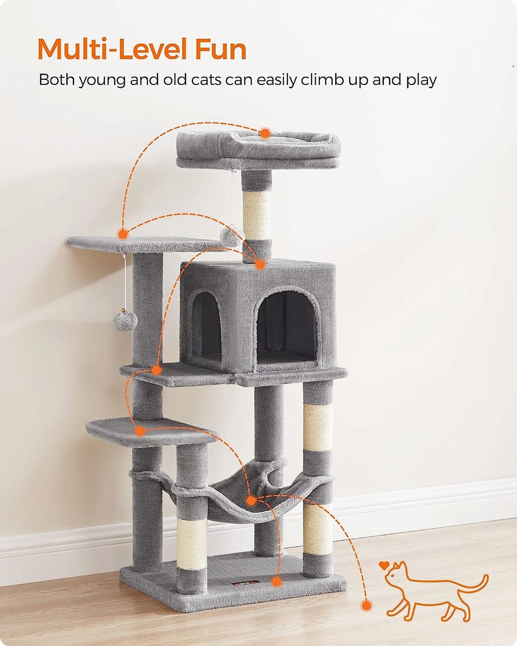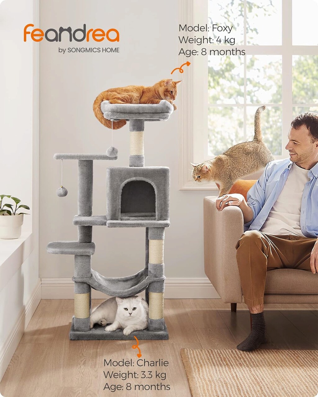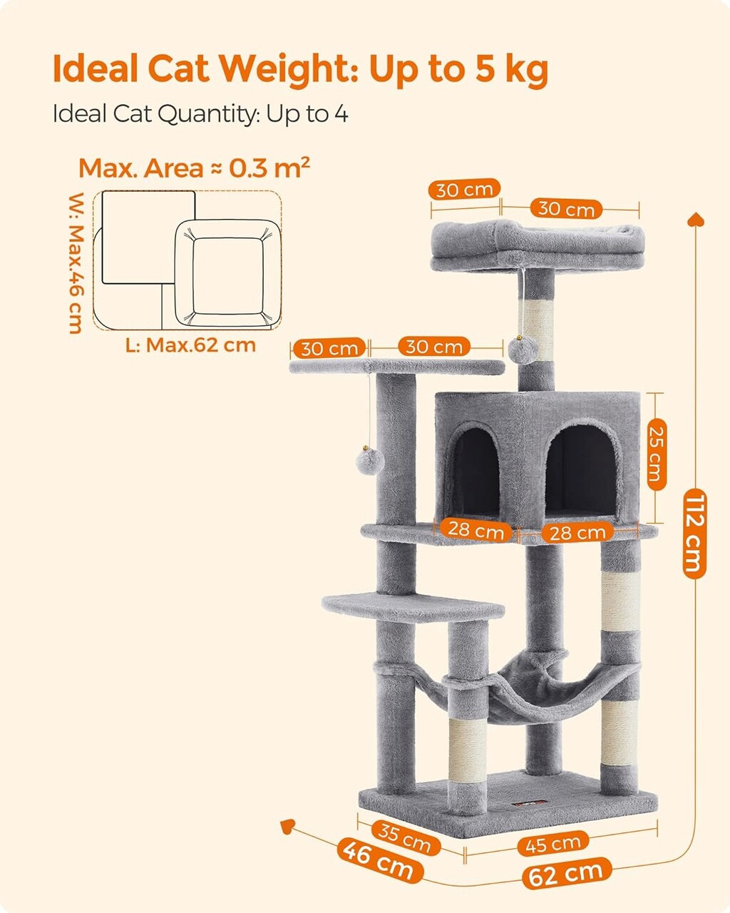 Ansamblu de joaca pisici cu hamac / arbore pentru pisici, Feandrea, max 40 kg, 45x35x112 cm, PAL/plus/sisal, gri deschis