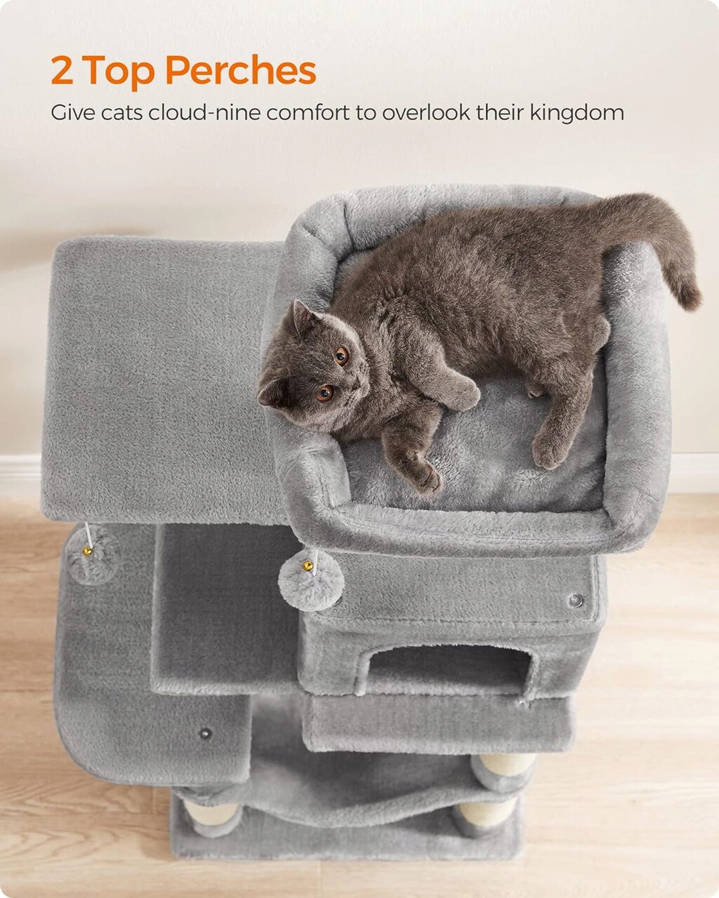 2 pervazuri si 1 pestera Acest arbore pentru pisici are doua pervazuri superioare si o pestera confortabila pentru pisici, oferind mai multe spatii pentru ca pisicile sa se relaxeze si sa observe - perfect pentru locuintele cu mai multe pisici.