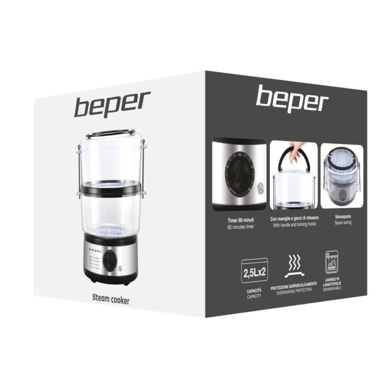 Aparat de gatit la aburi BC.261, Beper, 500 W, 2 recipiente pentru gatit