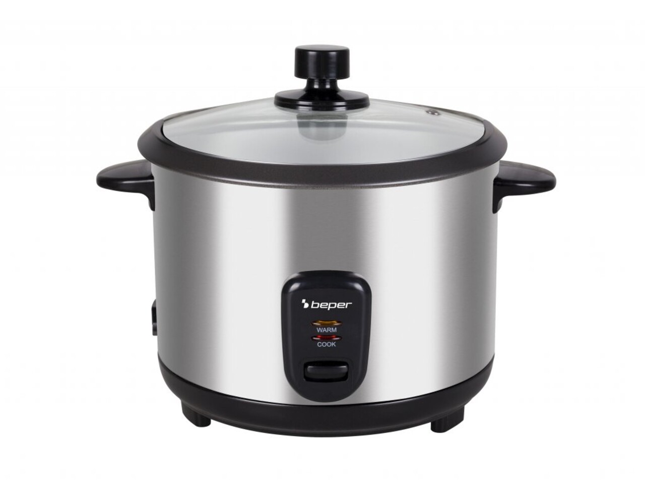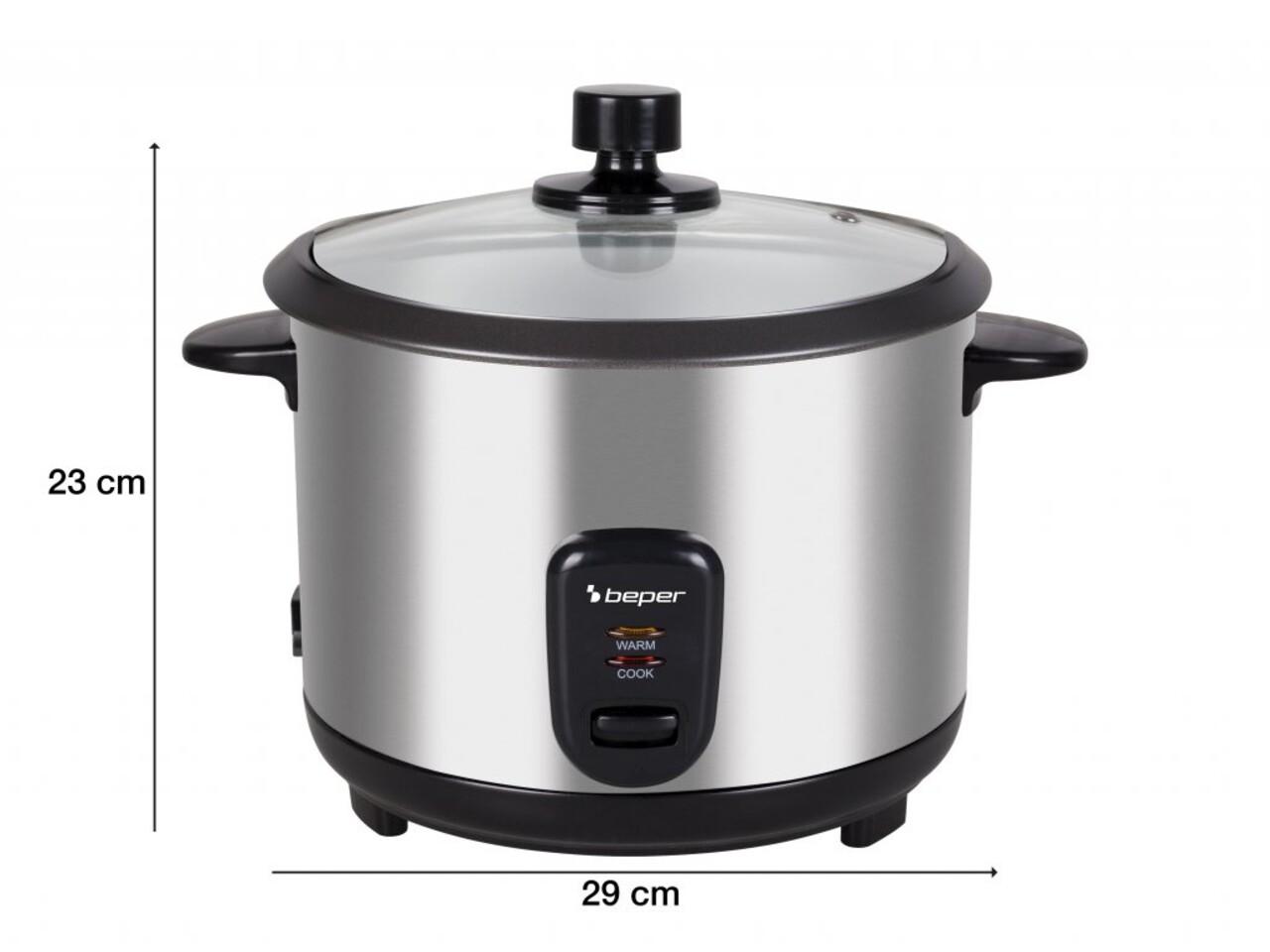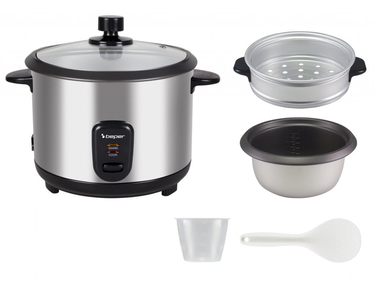 Aparat de gatit orez, cu aburi Beper, 400 W, 29x23 cm, aluminiu/sticla/otel, argintiu/negru