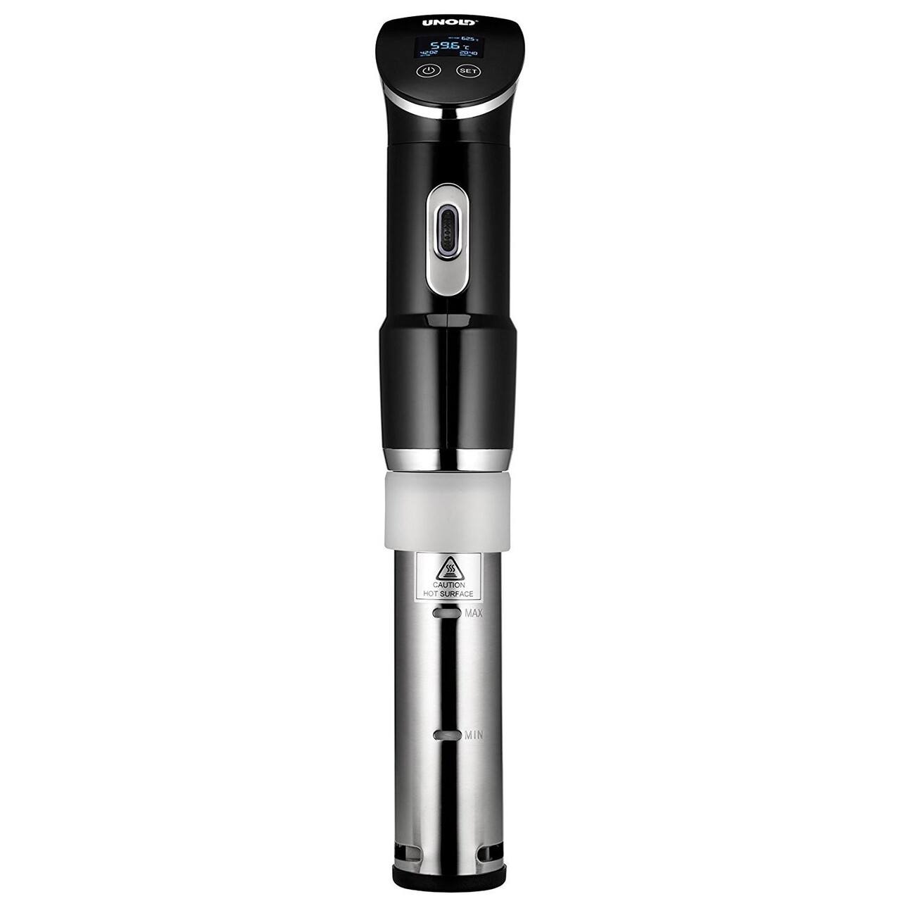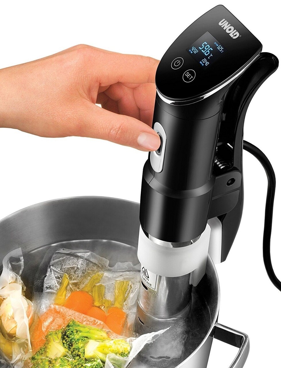 Aparatul de la Unold a fost special gandit pentru aceasta tehnica de gatit, intrunind toate calitatile unei utilizari simple si eficiente. De dimensiuni reduse si ocupand un minim de spatiu in bucatarie, aparatul functioneaza in cel mai simplu mod cu putinta: il atasezi de recipientul cu apa (in care urmeaza sa fie asezate pungile cu alimente, vidate), ii setezi temperatura la care doresti sa ajunga apa si...il pornesti.