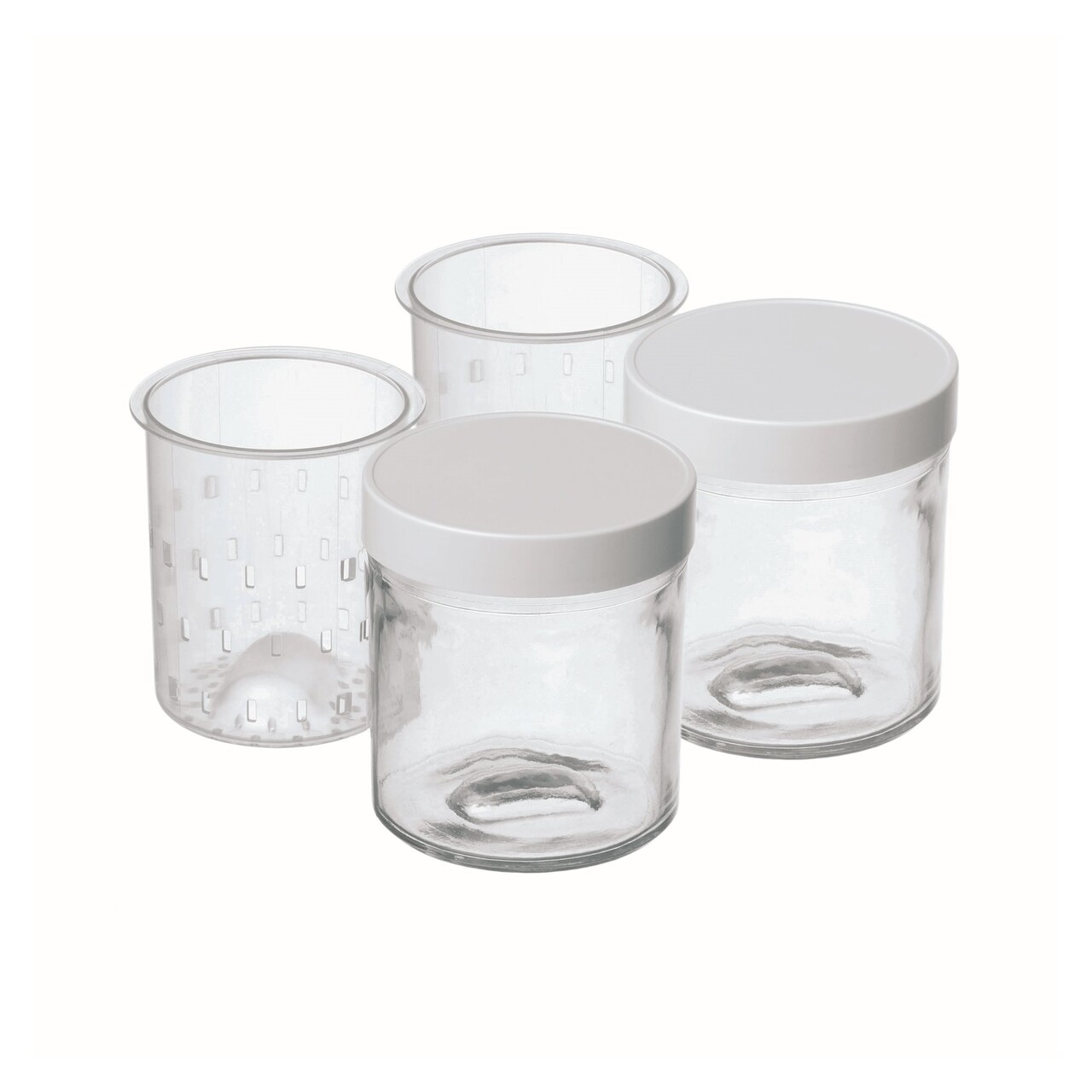 - 2 borcane din plastic de 250 ml cu 2 site pentru branza;
