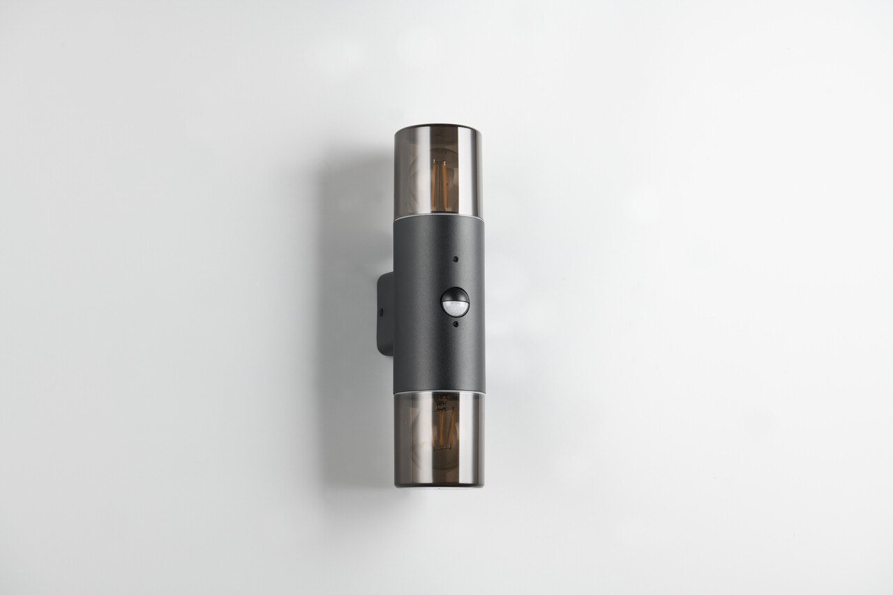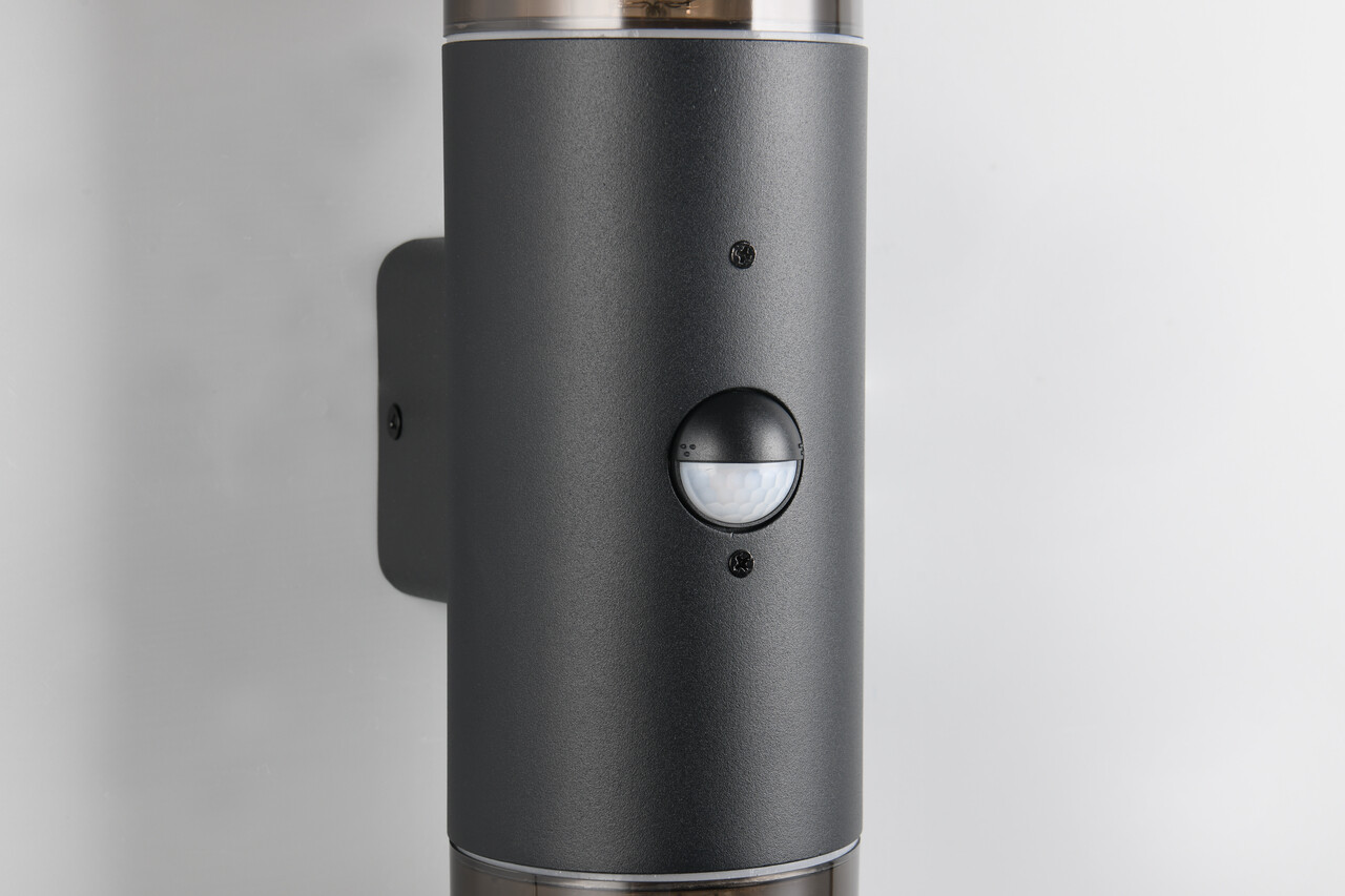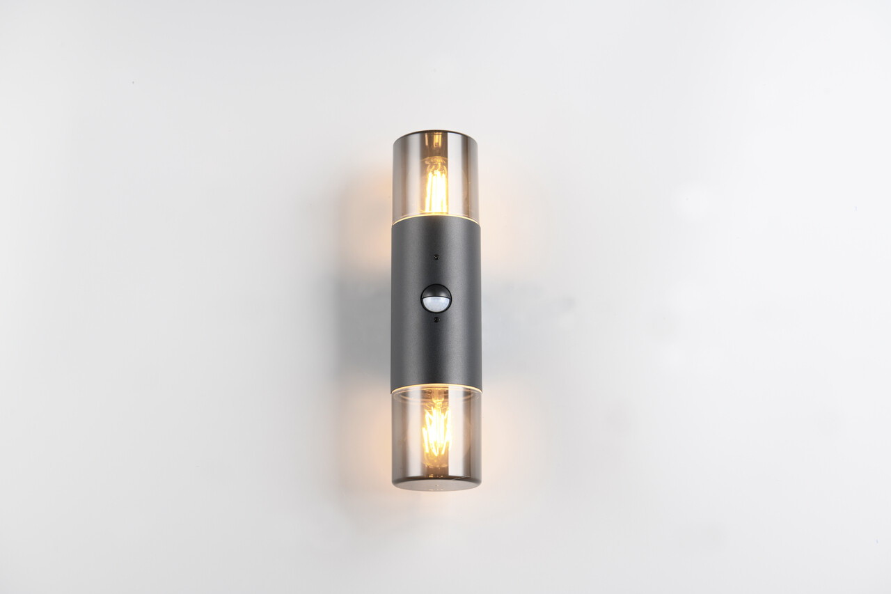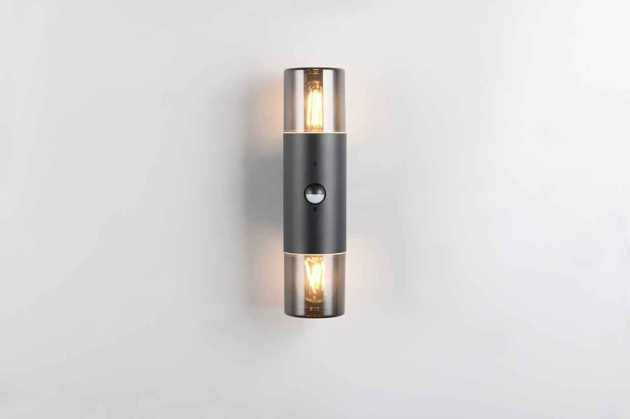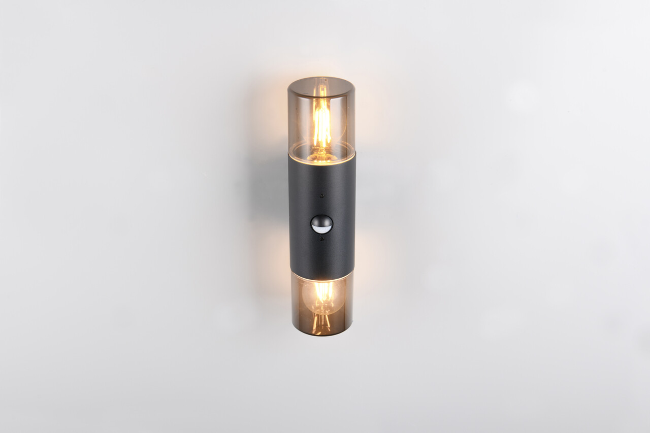 Aplica de perete pentru exterior cu senzor Hoosic, TRIO, 8.5x11.8x33 cm, 28W, 2x E27, aluminiu, negru mat