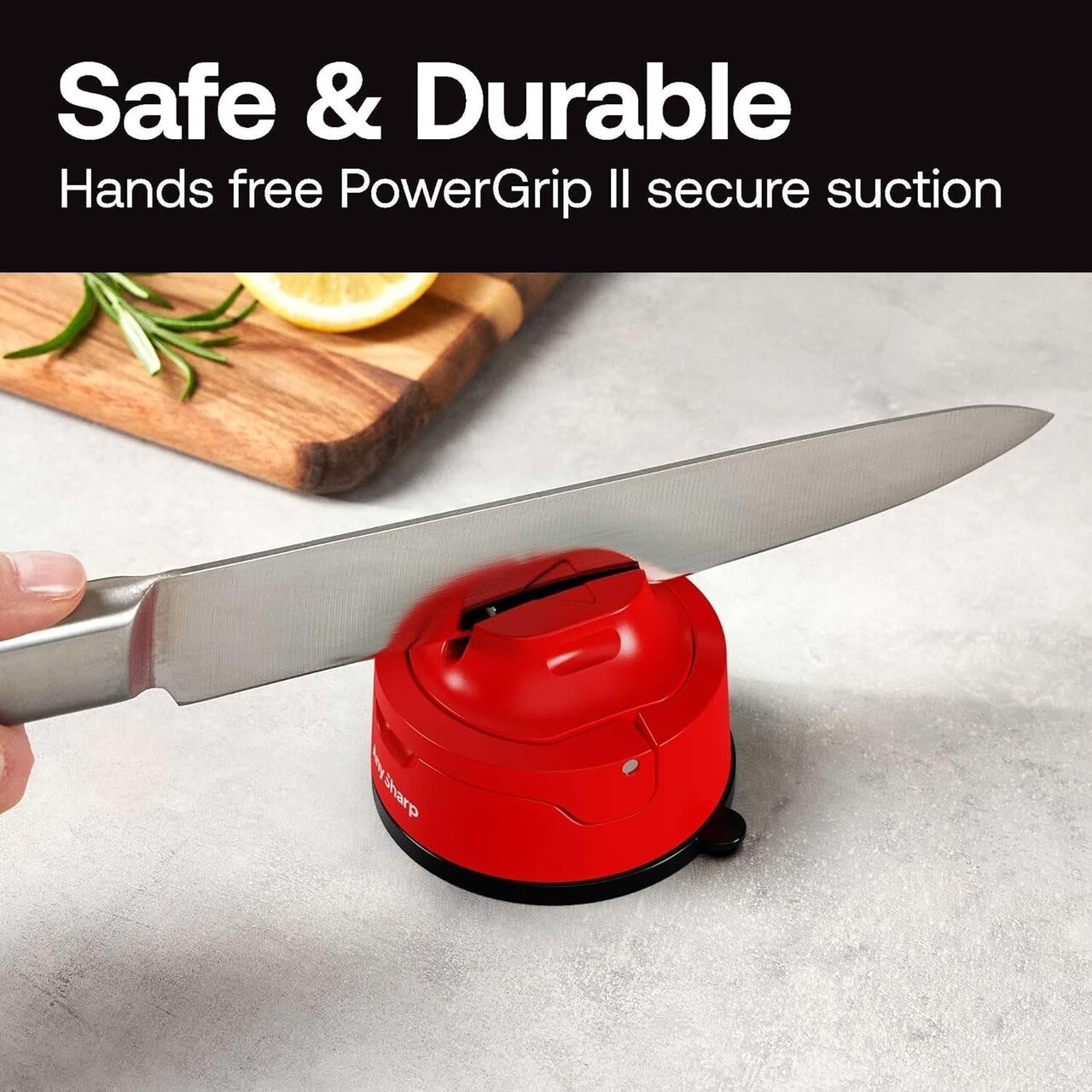 Baza ascutitorului de cutite AnySharp Evo este dotata cu o Ventuza PowerGrip II Imbunatatita, Cu o putere mai mare de aspiratie, Astfel ca se fixeaza in siguranta pe orice suprafata neteda fara a fi necesare unelte.