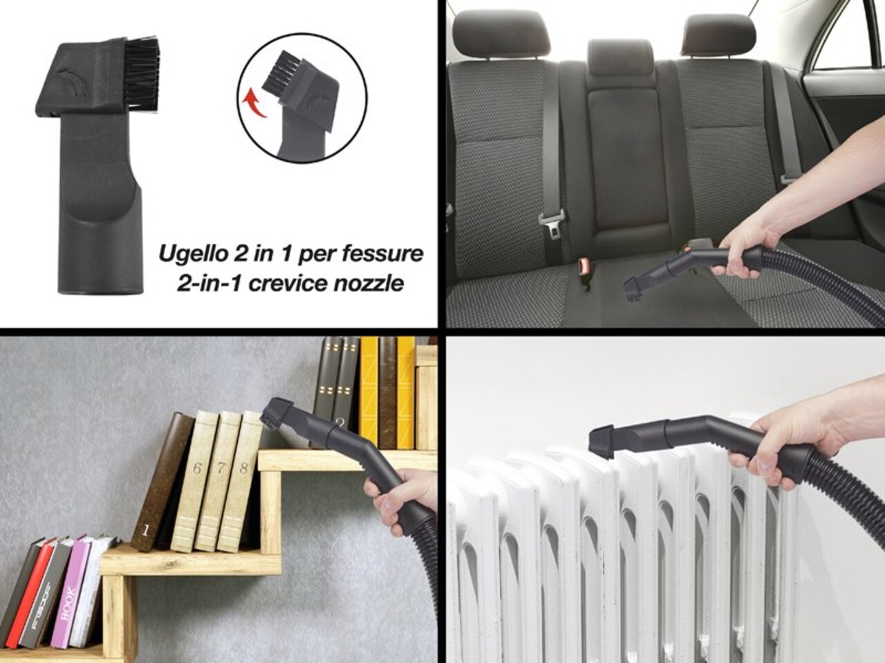 Include accesorii: filtru burete, filtru tesatura / nontesatura, perie podea, duza pentru spatii inguste 2 in 1, sac de hartie cu orificiu cu diametru 56 mm.