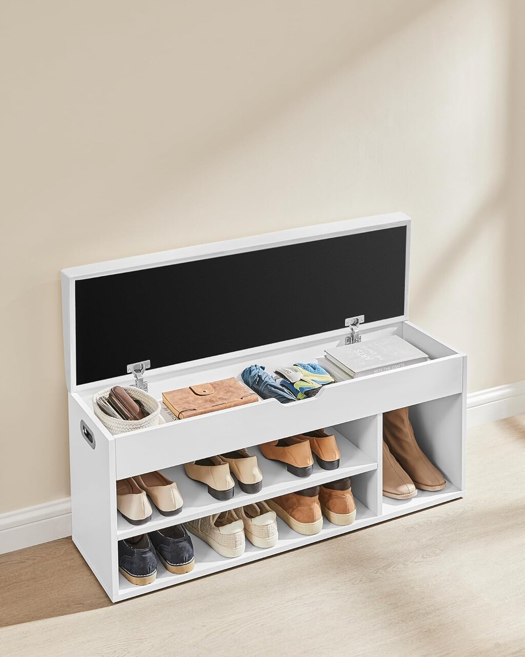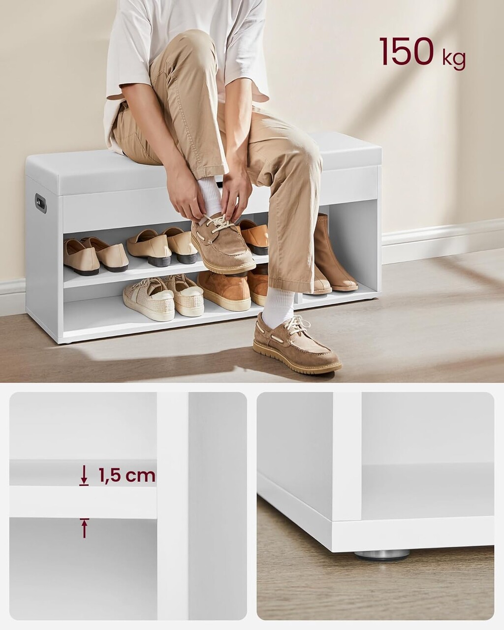 Capacitate mare Aceasta banca pentru pantofi, care masoara 100 x 30 x 44 cm, are un compartiment de depozitare adanc de 7 cm sub scaun, care va permite sa depozitati manusi, carti si multe altele. Rafturile deschise de mai jos pot gazdui pana la 8 perechi de pantofi sau echipamentul dvs. sportiv.