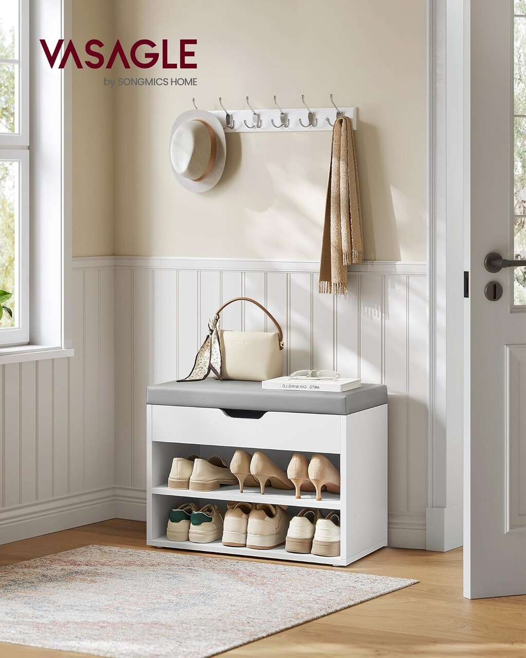 Bancheta cu pantofar, Vasagle, 60x30x44 cm, max 136 kg, MDF/PAL/piele ecologica, alb cloud