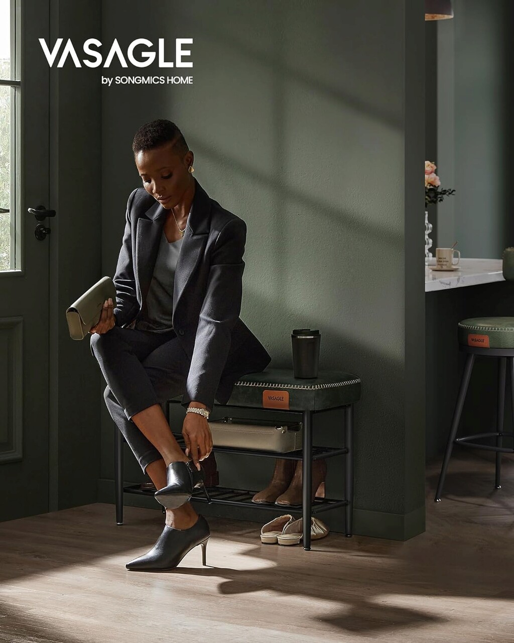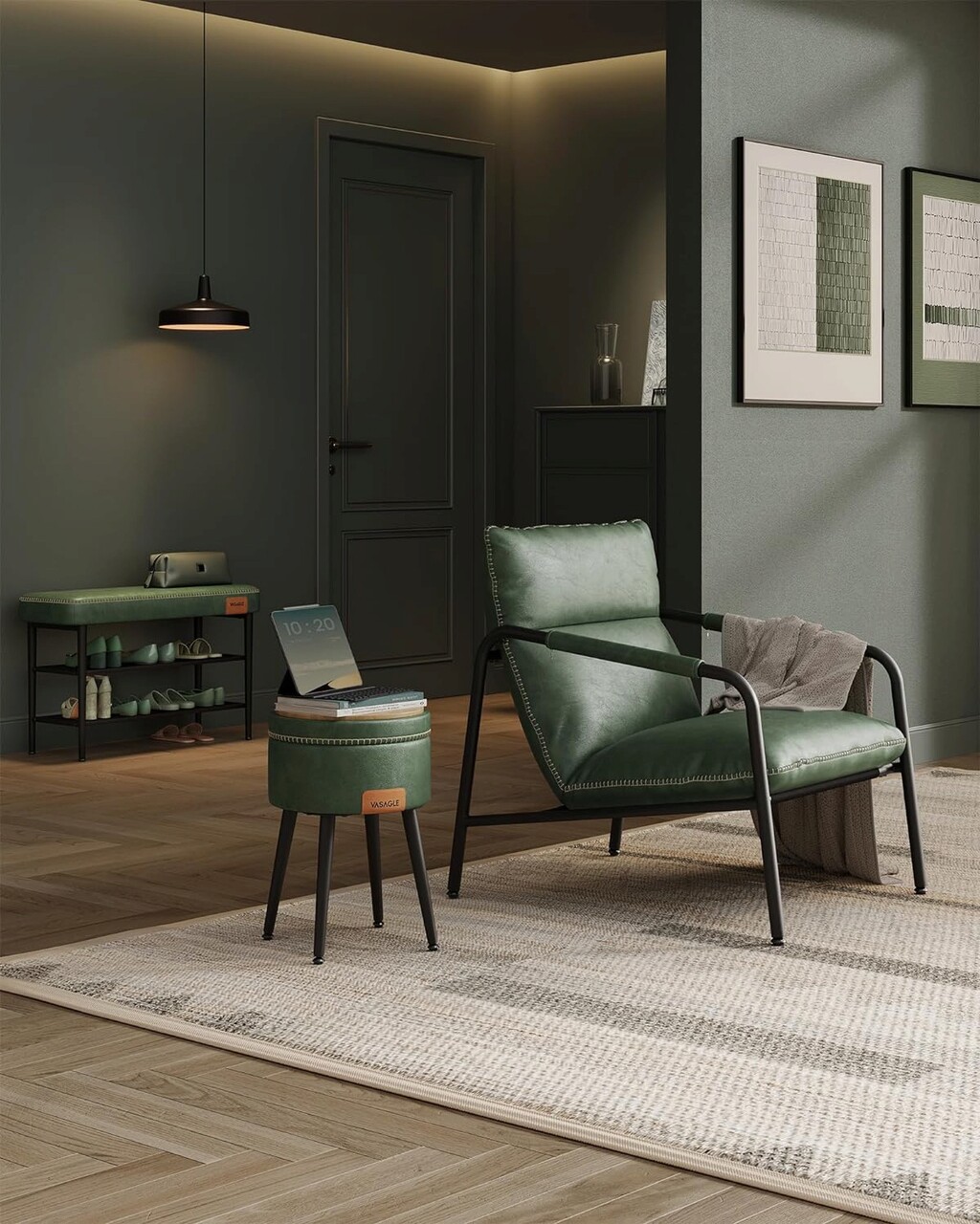 Bancheta cu pantofar Vasagle Ekho, 80 x 30 x 50 cm, max 135 kg, piele ecologica/otel, verde padure