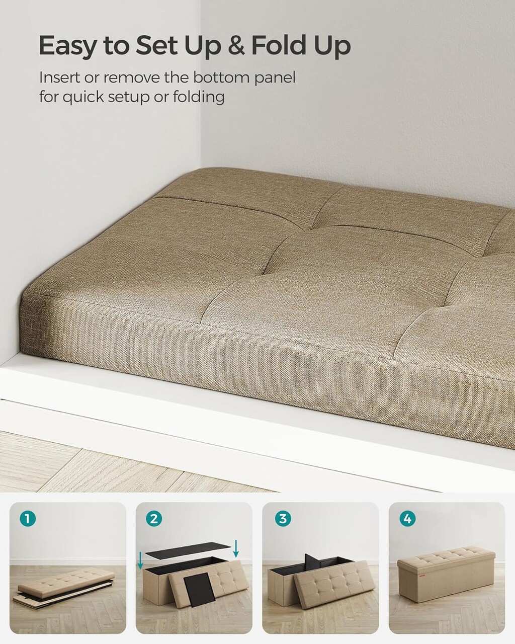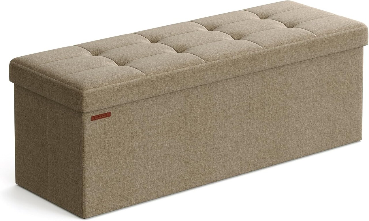 Bancheta cu spatiu de depozitare Mazi, Songmics, 110x38x38 cm, max 300 kg, MDF/imitatie de in, maro camel
