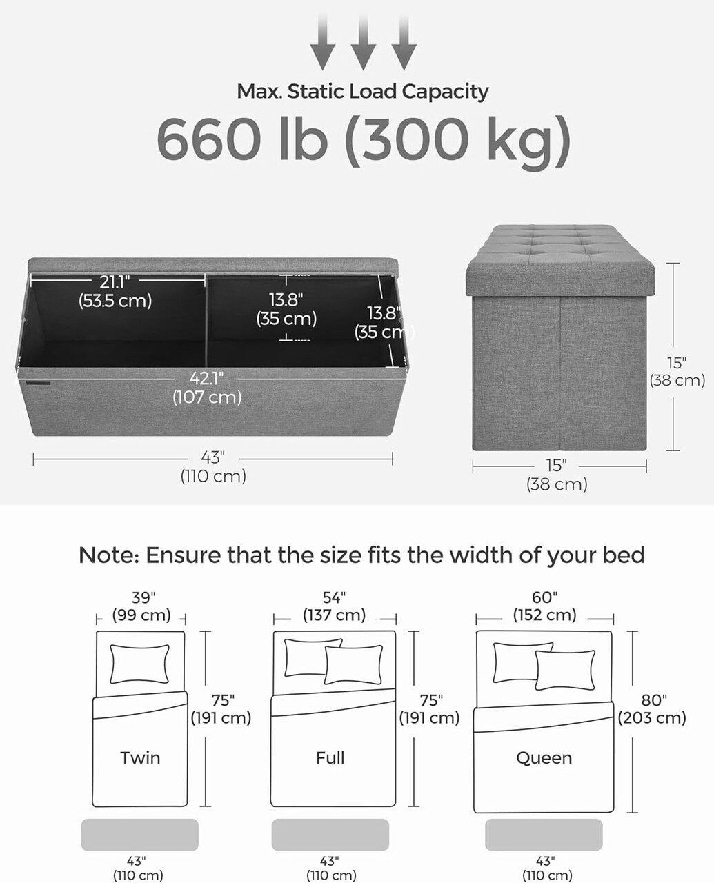 Spatiu de depozitare mare Cu dimensiuni de 38 x 110 x 38 cm si un volum de 131 L, ofera suficient loc pentru haine, carti, paturi sau lenjerii. Separatorul detasabil permite organizare flexibila.