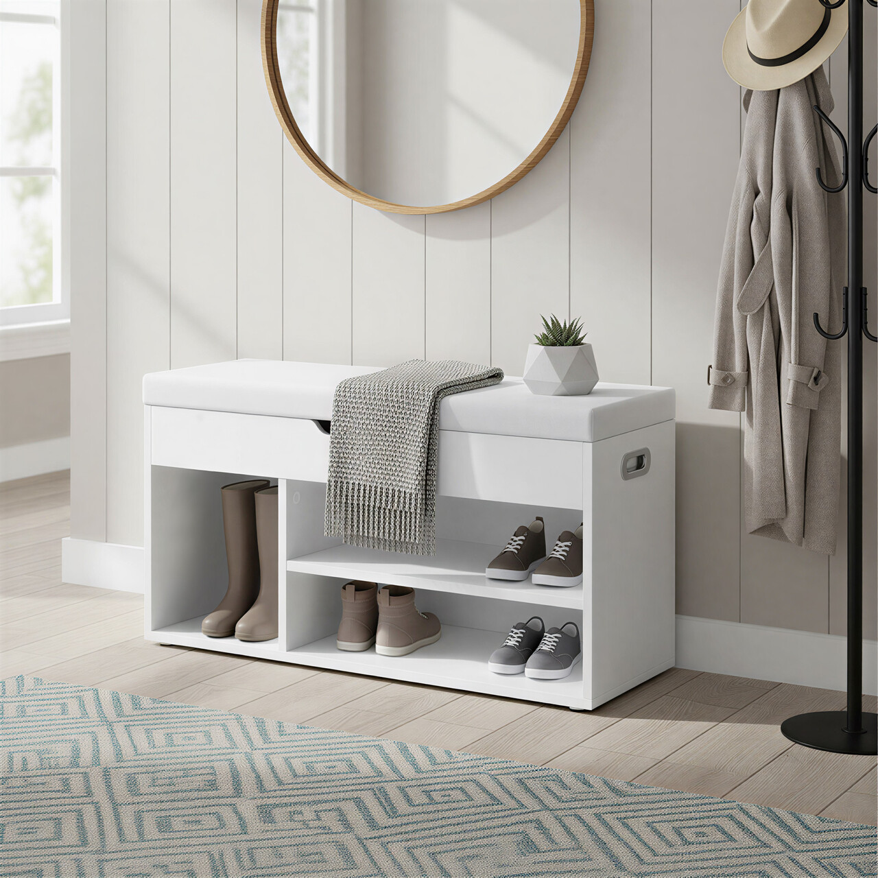 Spatiu generos de depozitare: Compartimentul de sub sezut este perfect pentru depozitarea manusilor, cartilor sau altor obiecte mici, iar rafturile deschise de dedesubt pot gazdui pana la 7 perechi de pantofi.