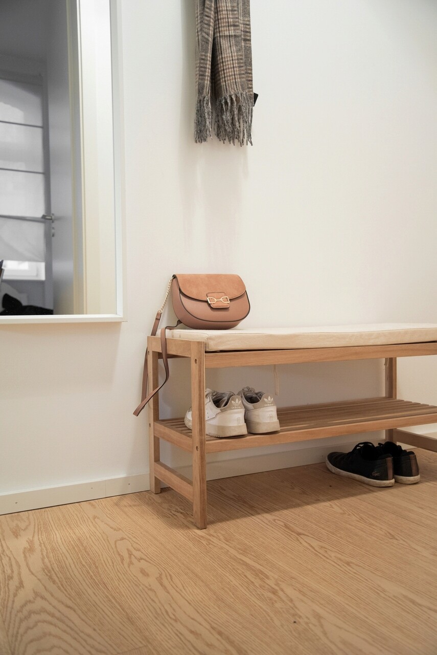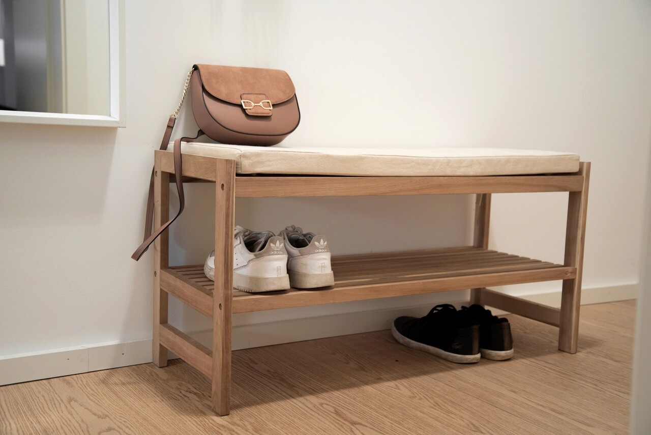 Bancheta cu spatiu depozitare pentru pantofi, Wenko, Acina, 90 x 34 x 45 cm, lemn de acacia, natur/crem