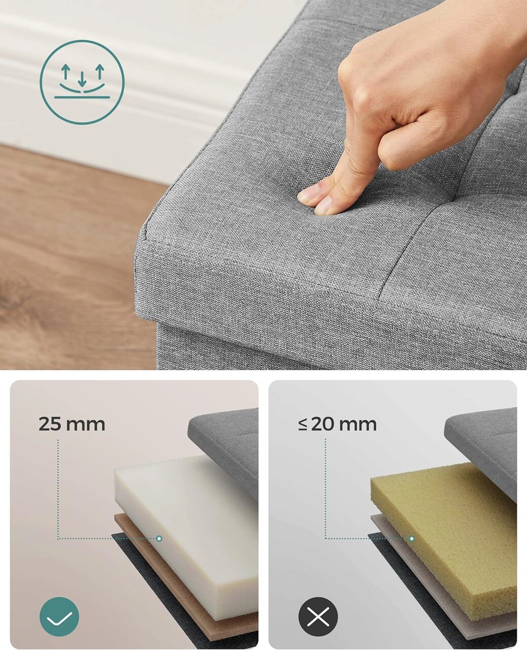 Bancheta cu spatiu pentru depozitare Ottoman, Songmics, 76 x 38 x 38 cm, pliabila, imitatie in/MDF, gri