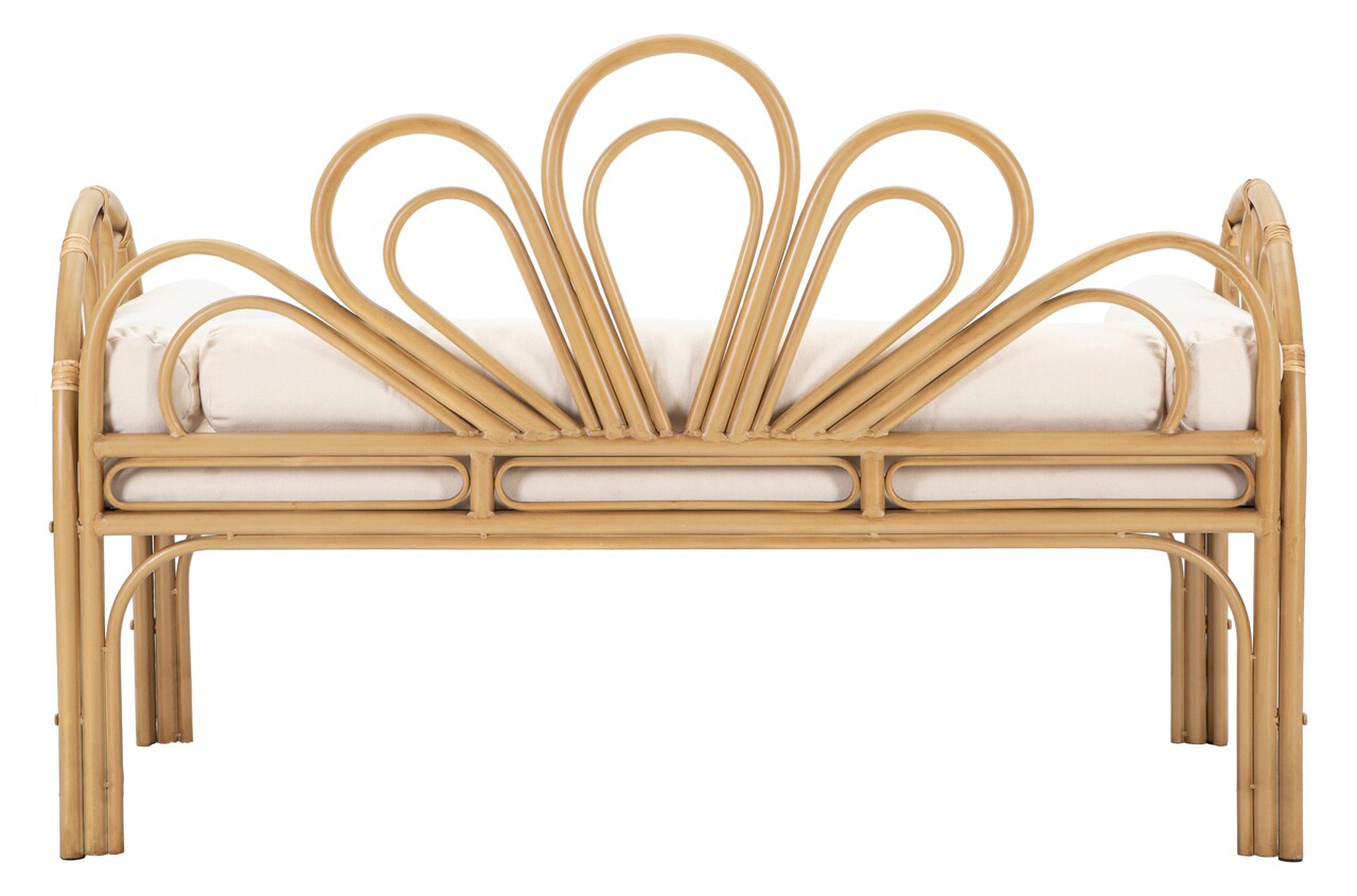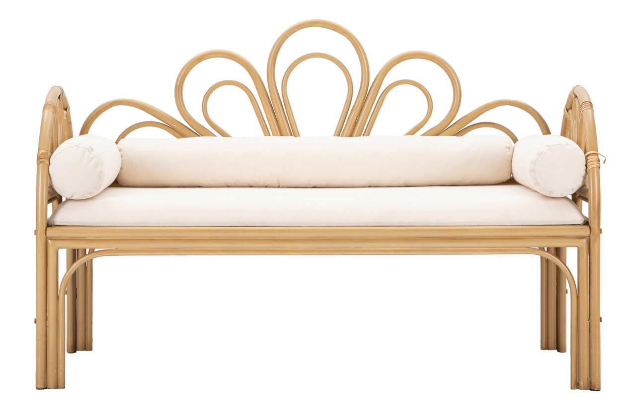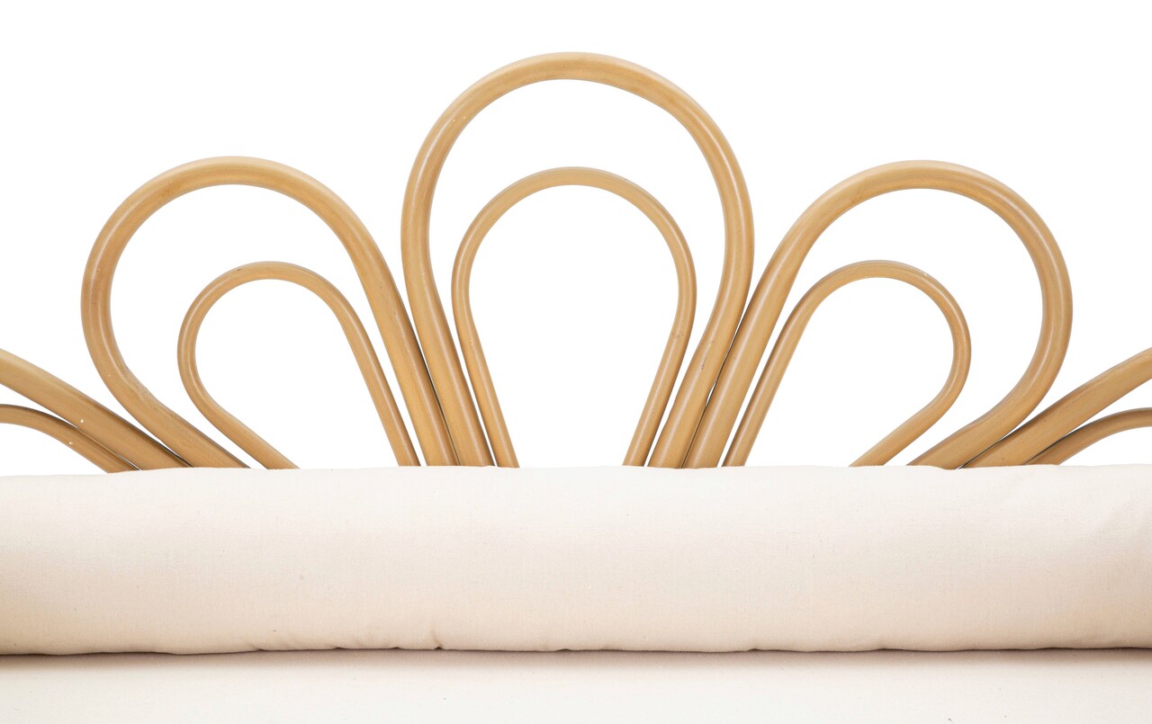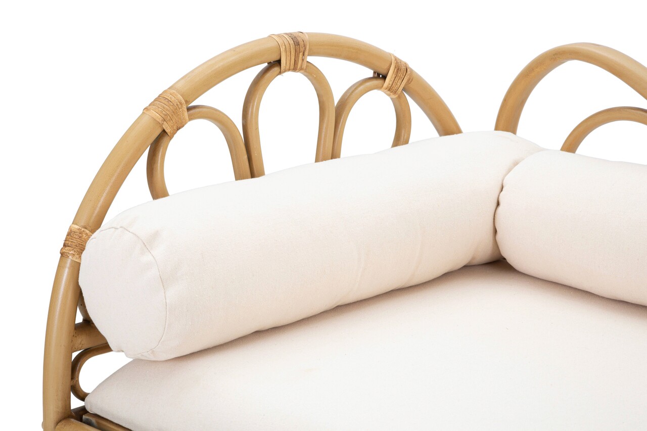 Bancheta dreptunghiulara cu brate si spatar din metal cu finisaje din ratan si sezut tapitat in tesatura alba, completata cu perne tubulare.