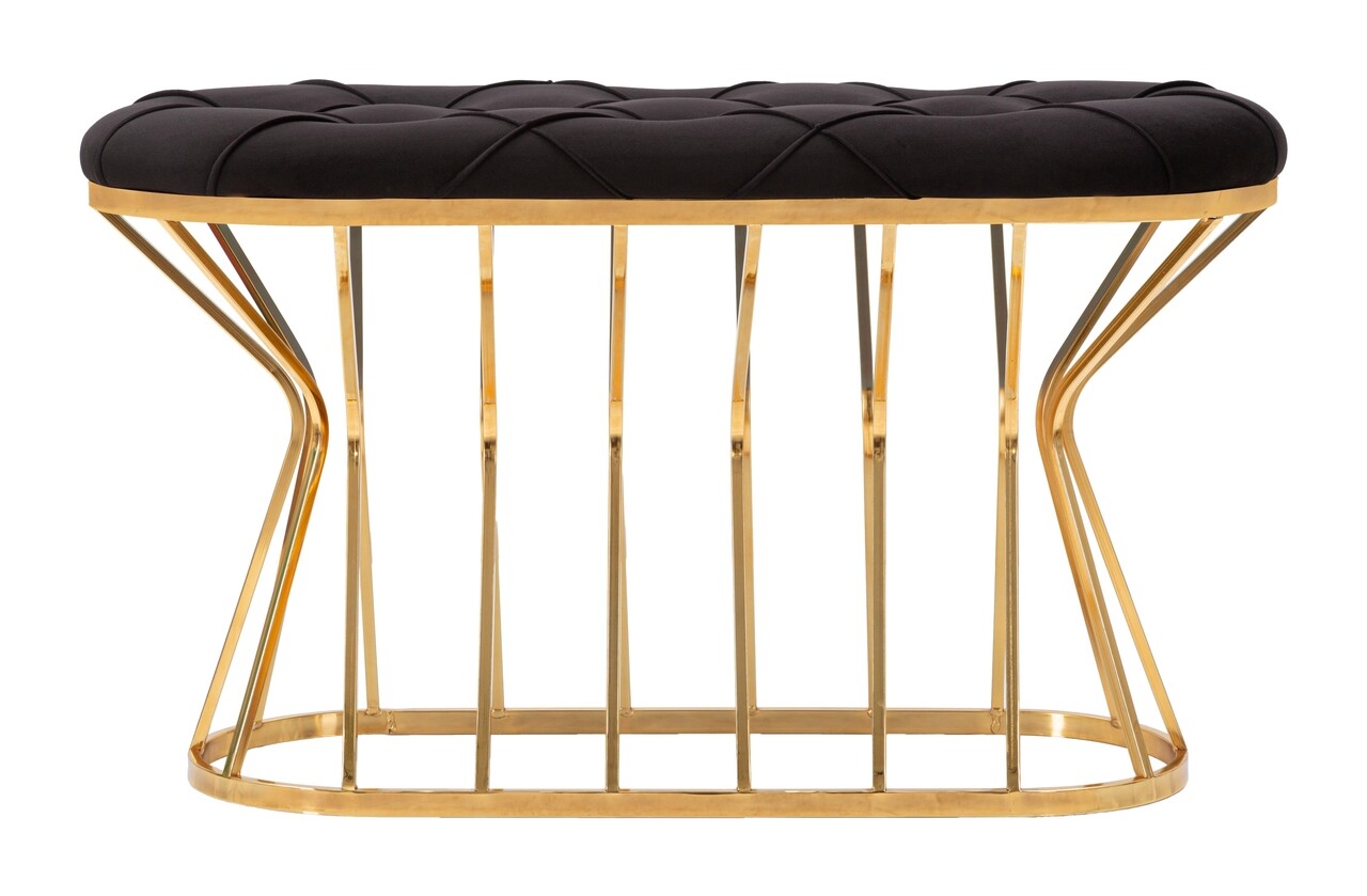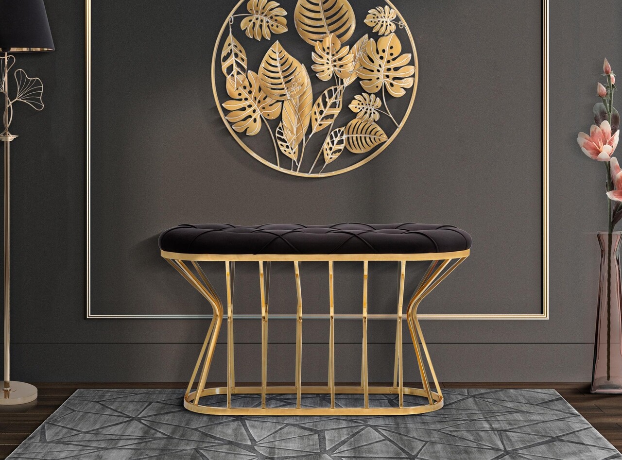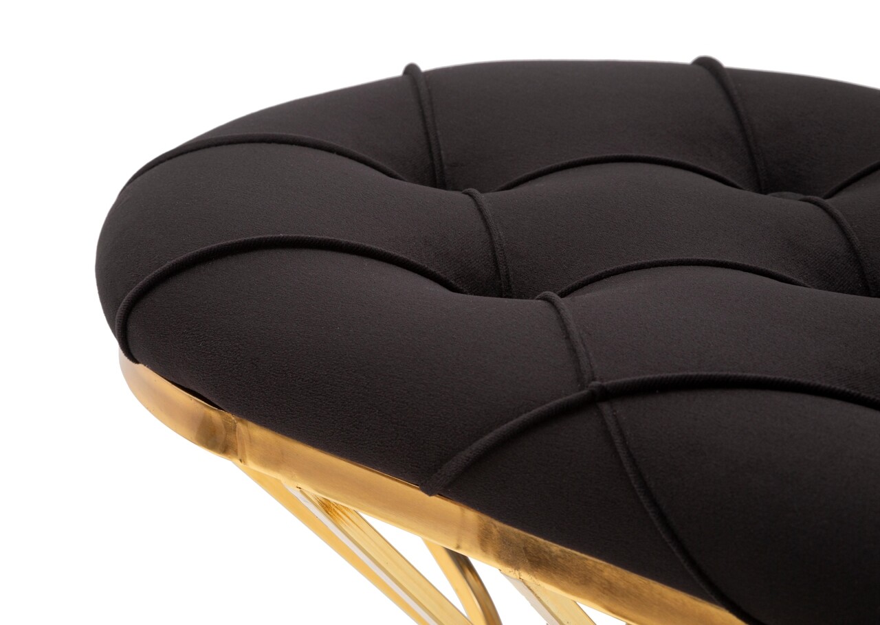 Bancheta ovala cu structura din metal auriu si sezut din catifea sintetica neagra captusita si matlasata. Designul simplu, dar captivant, va intampina in fiecare moment de relaxare.