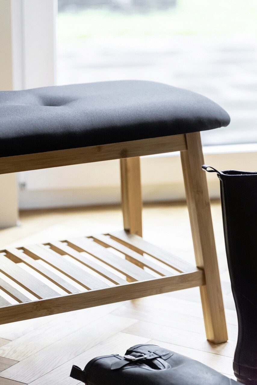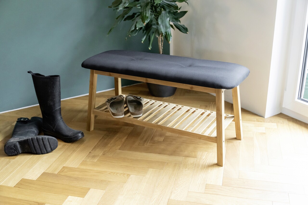 Bancuta cu suport depozitare incaltaminte, Wenko, Ecori, 90 x 33 x 45 cm, bambus/poliester/polietilena, natur/negru
