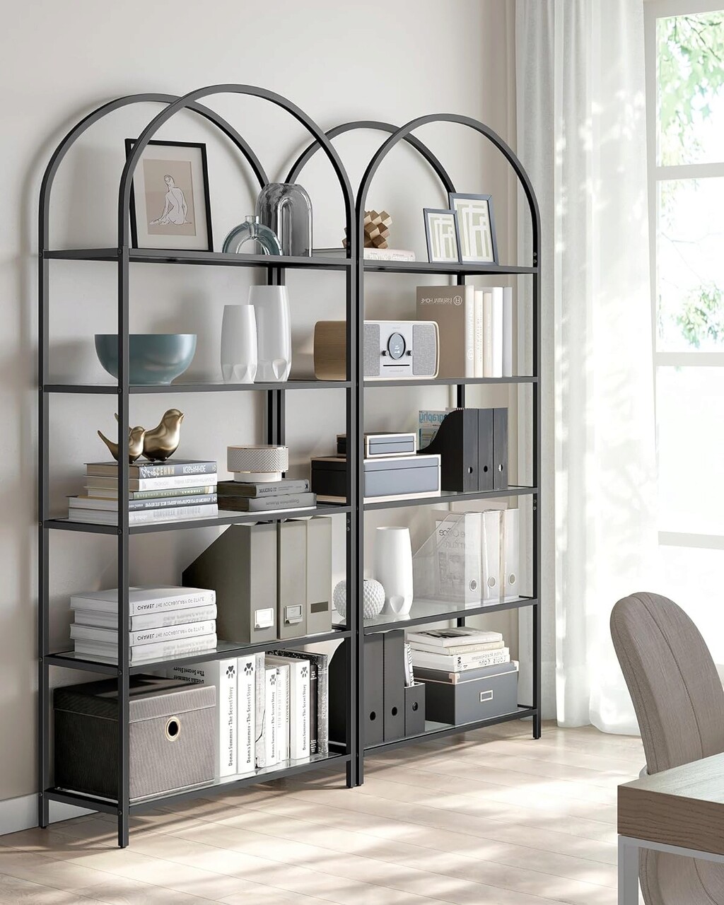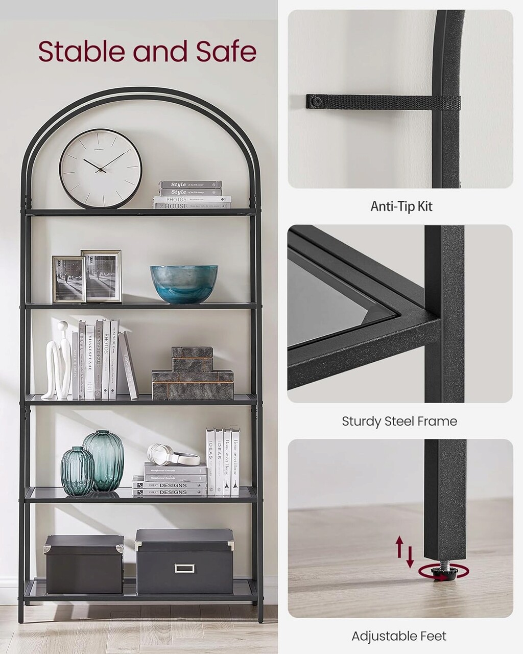 Biblioteca Arched Design, Vasagle, 83x30.2x183.5 cm, otel/sticla temperata, negru