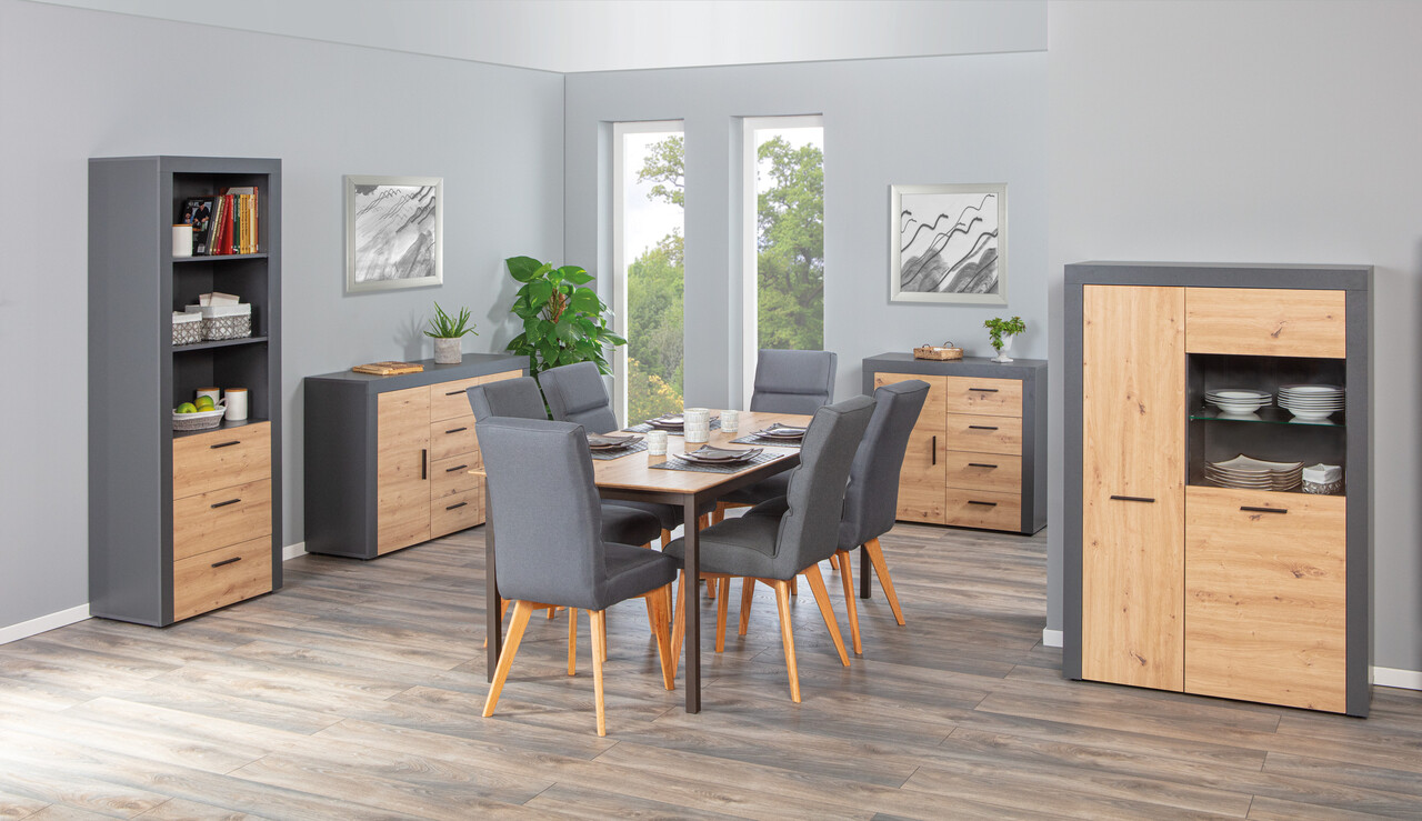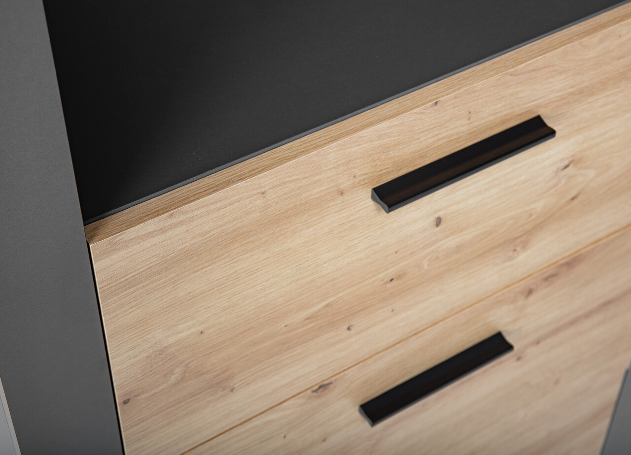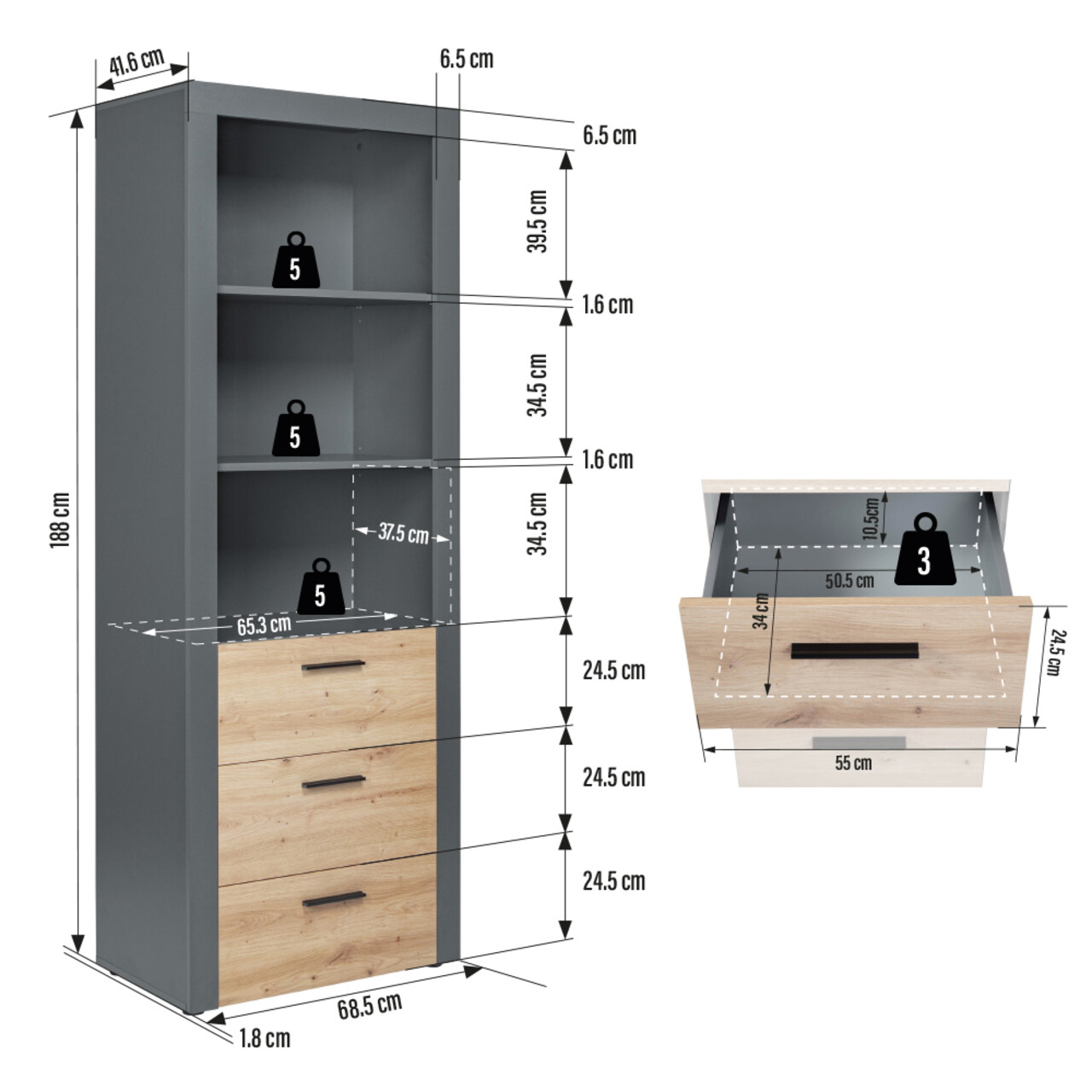 Raft independent modern, in gri la moda - Combinatie artizanala cu spatiu amplu de depozitare! Trei sertare cu deschidere usoara ofera spatiu pentru diverse articole, in timp ce trei rafturi deschise ofera expunerea perfecta pentru obiecte decorative. Corbeto este fabricat din panouri melaminate. Suprafetele melaminate sunt rezistente la apa si grasime, fiind ideale pentru uz casnic. Acest raft independent este versatil! Foloseste-l la birou pentru documente sau ca biblioteca. Arata fantastic si atunci cand este decorat cu obiecte decorative!