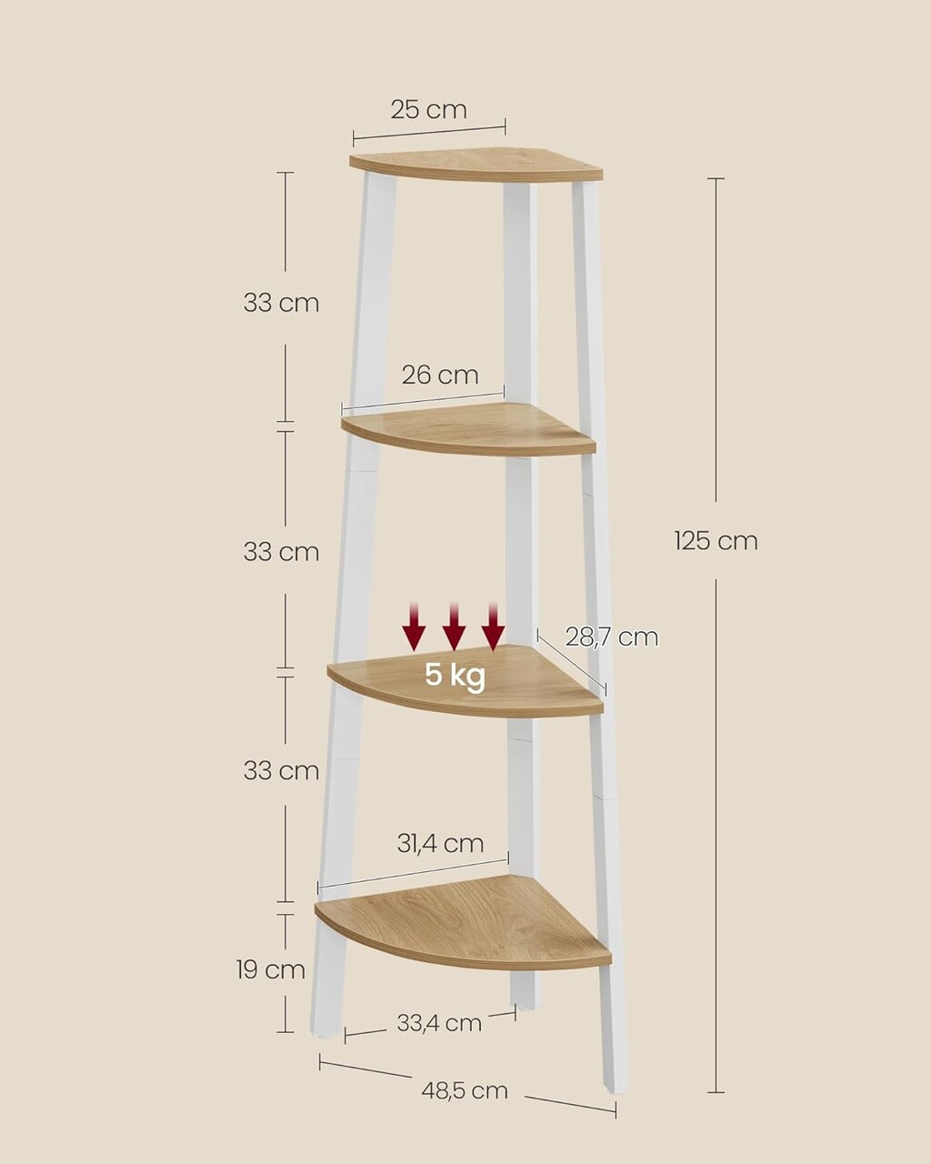 Biblioteca de colt Ladder, Vasagle, 33.4x33.4x125 cm, PAL/otel, alb/natural