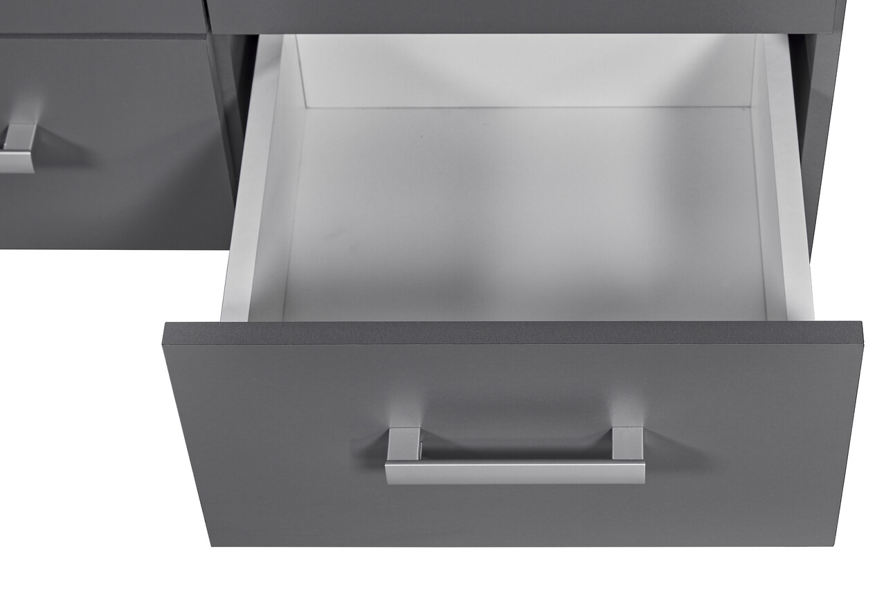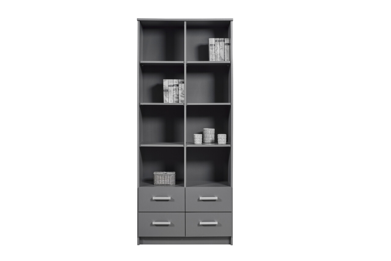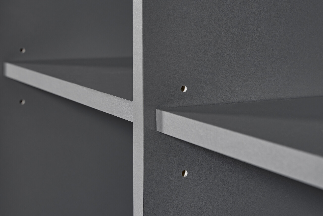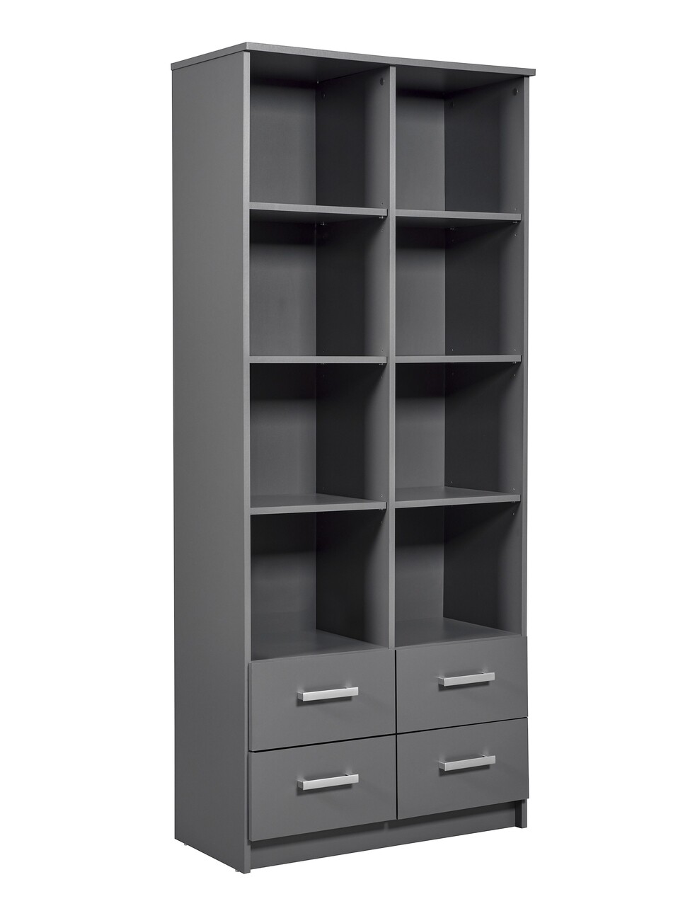 Proiecteaza-ti spatiul dupa preferinte cu seria ELENZIO. Aceasta biblioteca ofera 8 nise si 4 sertare pe sine extensibile, perfecte pentru depozitarea rechizitelor de birou, a cartilor sau a obiectelor decorative. Robusta si functionala, finisajul sau gri grafit adauga o nota moderna casei tale. De asemenea, este potrivita pentru a fi utilizata in living, sufragerie sau lounge. O idee utila de decorare: poti crea si mai mult spatiu de depozitare combinand mai multe unitati.