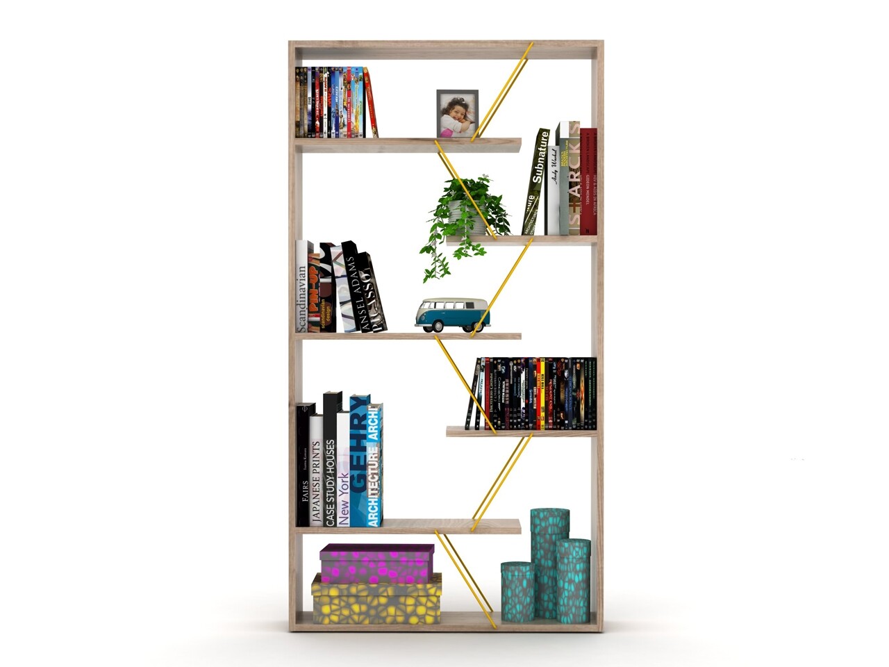 Biblioteca Rafevi Tars, 84 x 24 x 157 cm, PAL/metal, oak/galben