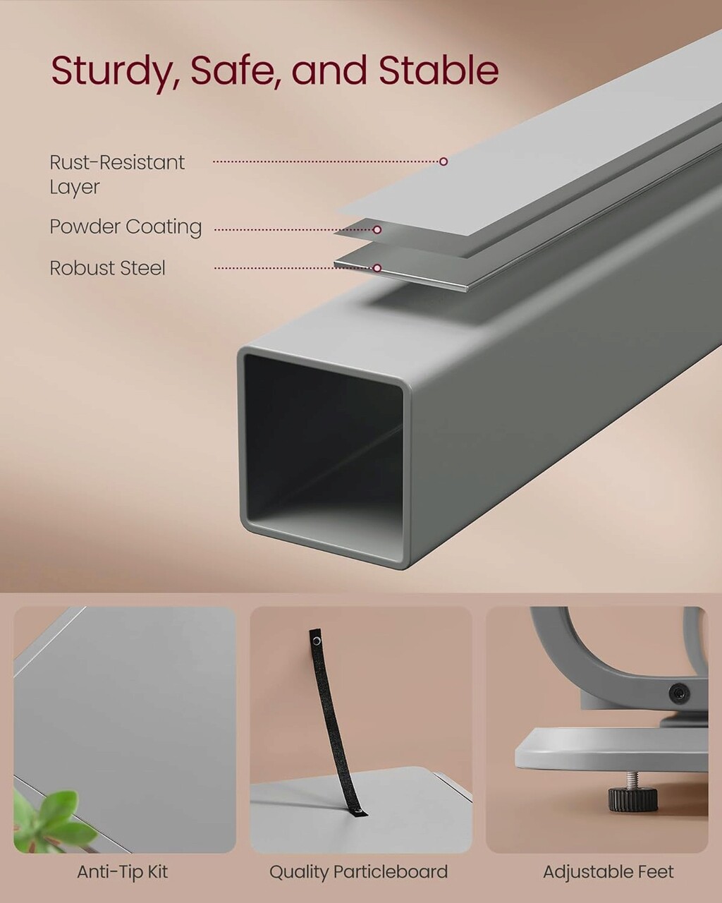 Siguranta si stabilitate Aceasta biblioteca rotativa este prevazuta cu un kit anti-inclinare pentru un plus de siguranta. De asemenea, include patru picioare reglabile pentru a asigura stabilitatea, chiar si pe podele usor denivelate.