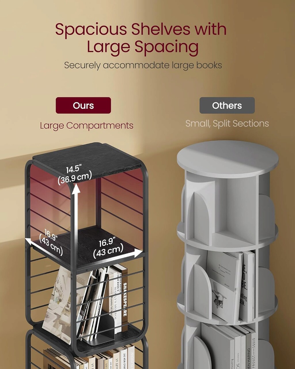 Biblioteca rotativa la 360 ° Cu designul sau inovator rotativ, cartea dvs. preferata este la doar o rotire distanta. Protectiile laterale din metal asigura ca obiectele nu vor cadea in timpul rotatiei, iar rafturile incapatoare, cu spatii mari, gazduiesc in siguranta cartile mai mari.
