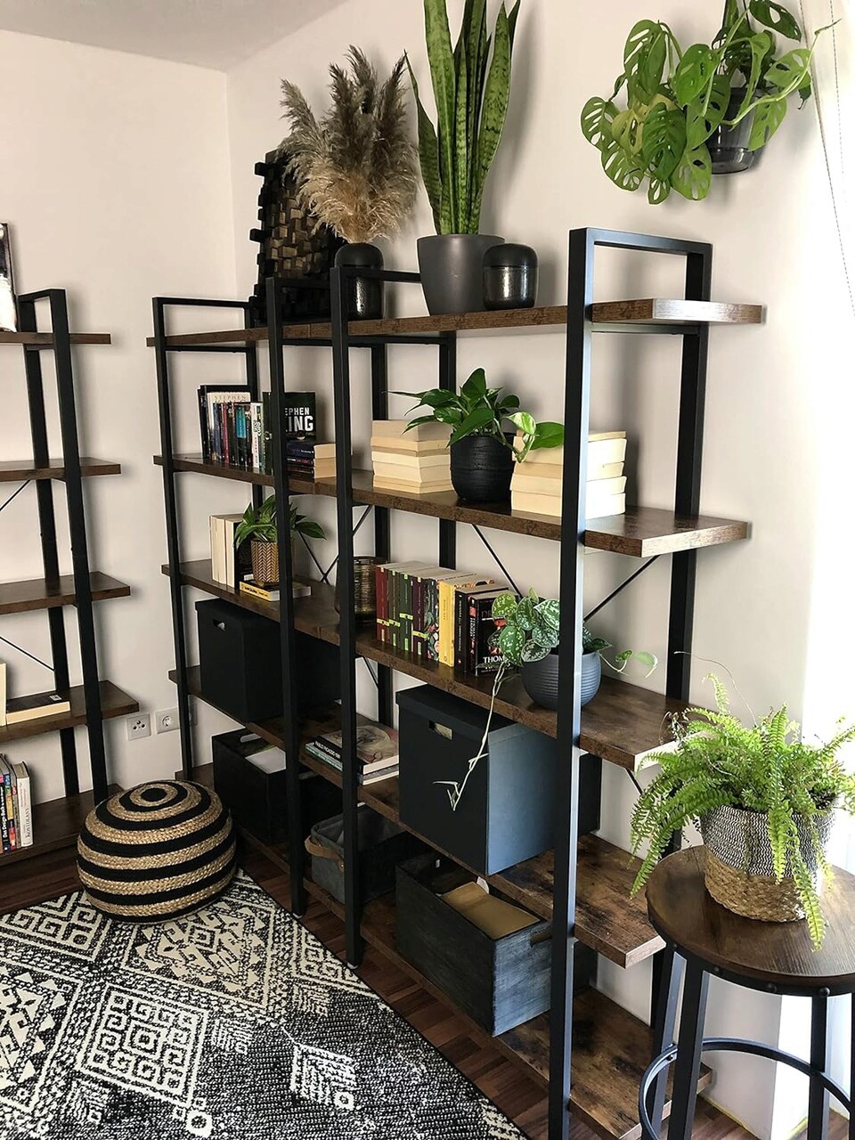 Atmosfera placuta: Cadru din otel negru combinat cu rafturi rustice – perfecta langa o canapea si o veioza pentru un colt de citit primitor.