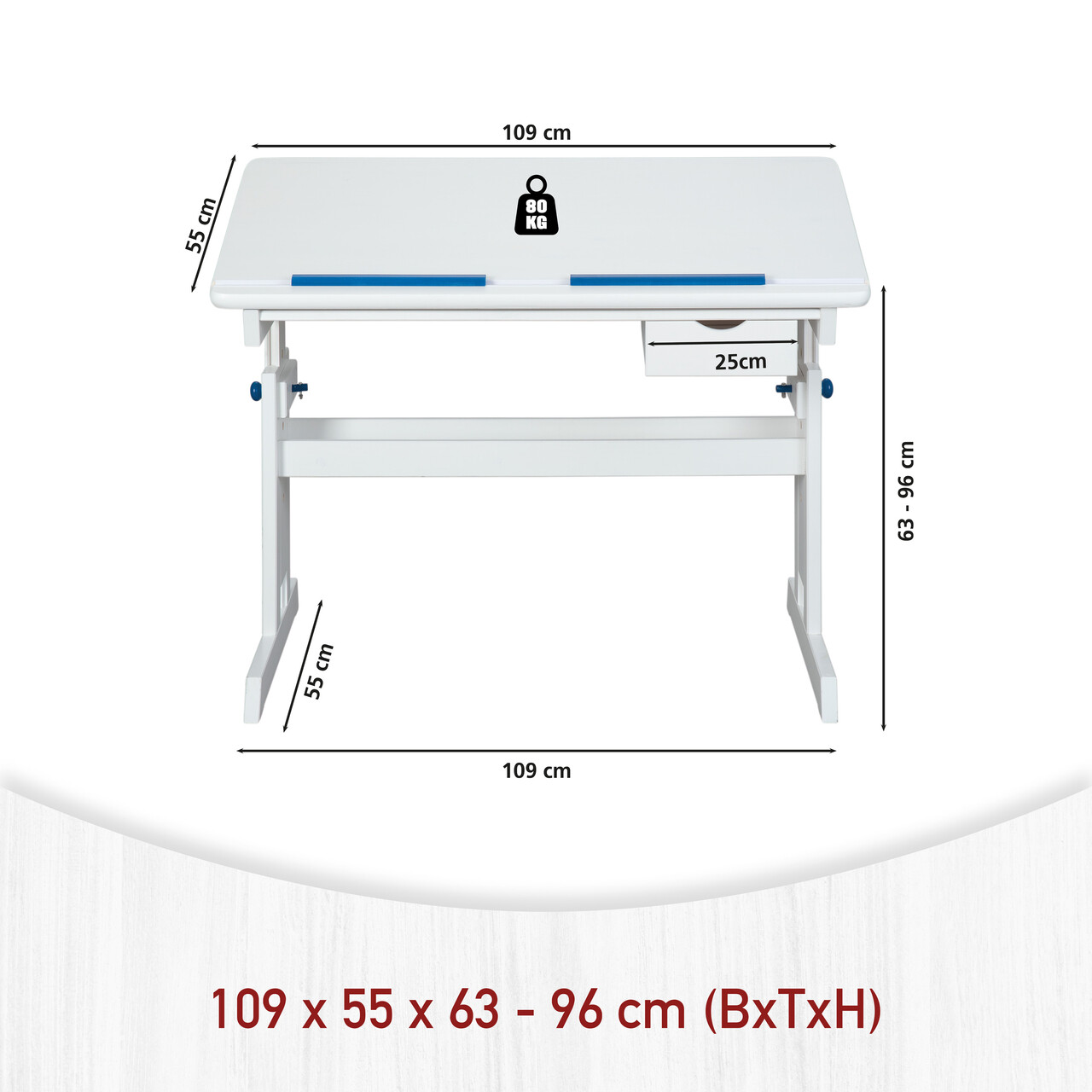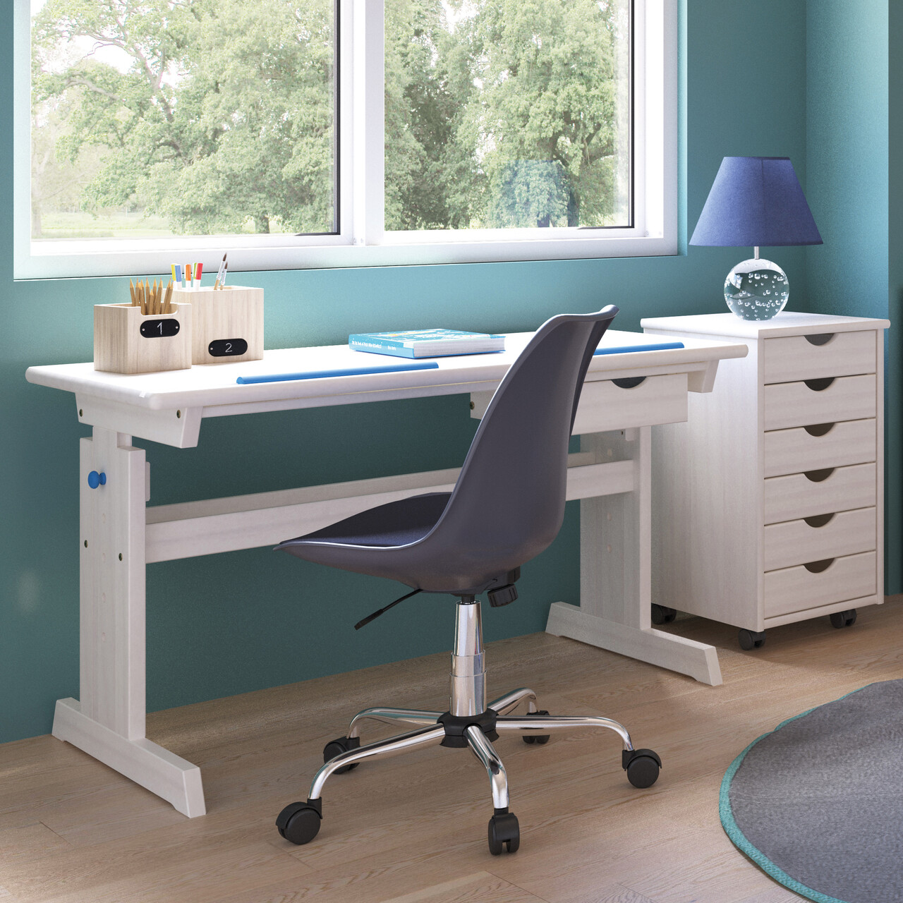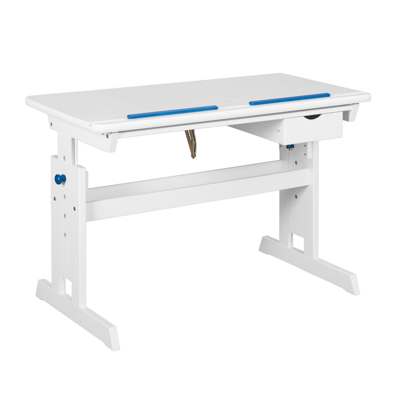 Pentru a se dezvolta corespunzator, copiii trebuie sa ramana activi. Masa pentru copii Baru poate fi ajustata la inaltimea copilului, permitand invatarea relaxata cu o postura corecta. Blatul rabatabil al mesei Baru poate fi ajustat in functie de activitate, prevenind problemele posturale care pot rezulta din statul prelungit si incorect pe scaun. Sertarul ofera depozitare convenabila pentru materialele didactice. Cadrul este vopsit in alb, iar pentru a evidentia caracterul natural al lemnului masiv, modelul unic de fibra ramane vizibil. Blatul are un strat de melamina alba, rezistent la murdarie si usor de curatat datorita suprafetei sale netede. Blatul are doua suporturi care permit asezarea caietelor si a cartilor intr-un unghi. Sunt incluse accente albastre si roz, permitandu-va sa alegeti combinatia preferata.