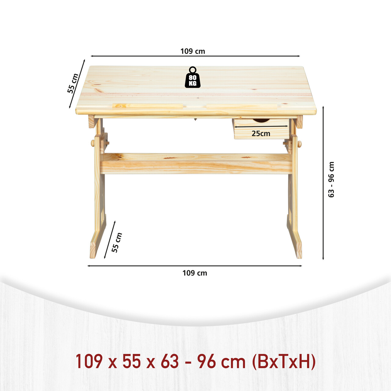 Pentru a se dezvolta corespunzator, copiii trebuie sa ramana activi. Masa pentru copii Julia poate fi ajustata la inaltimea copilului, permitand invatarea relaxata cu o postura corecta. Masa Julia poate fi utilizata pentru diverse activitati. De exemplu, atunci cand pictati sau desenati, blatul mesei poate fi inclinat pentru a promova concentrarea. Toate materialele didactice pot fi depozitate in sertar. Cu Julia, veti experimenta intreaga frumusete a lemnului masiv de pin parfumat. Pentru a proteja lemnul, suprafata a fost tratata cu un lac transparent cu emisii reduse de gaze. Lacul este hidrofug si usor de curatat. Modelele unice de textura a lemnului sunt vizibile. Masa pentru copii este fabricata din lemn masiv si finisata cu un lac transparent. Acest lac protejeaza suprafata si este hidrofug. Lemnul masiv de pin parfumat a fost fabricat conform celor mai recente standarde europene de procesare. Textura naturala a lemnului este pusa in valoare frumos. Blatul rabatabil este echipat cu doua suporturi, astfel incat cartile sau caietele pot fi asezate pe masa chiar si atunci cand sunt inclinate.