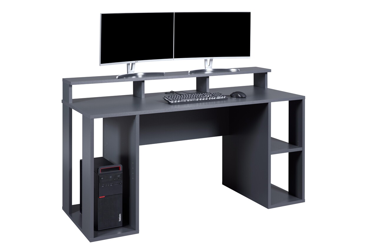 Experimentati biroul de gaming XXL MATCH POINT! Conceput de jucatori pentru jucatori, acest birou este un element indispensabil pentru orice configuratie serioasa de gaming! Blatul are 160 cm latime si 66.5 cm adancime. Raftul superior are peste 20 cm adancime si 160 cm lungime, oferind spatiu amplu pentru mai multe monitoare, iar dimensiunile sale permit amplasarea suporturilor pentru monitor mai mari. Sistemul discret de gestionare a cablurilor asigura o configuratie curata si organizata. Spatiul turnului poate fi ajustat pentru a se potrivi aproape oricarei nevoi: raftul poate fi montat pe stanga sau pe dreapta. Deschiderea laterala permite o ventilatie adecvata si previne acumularea de caldura, comuna in cazul tavilor traditionale pentru turnuri. Ideal pentru sesiuni de gaming si utilizare acasa.