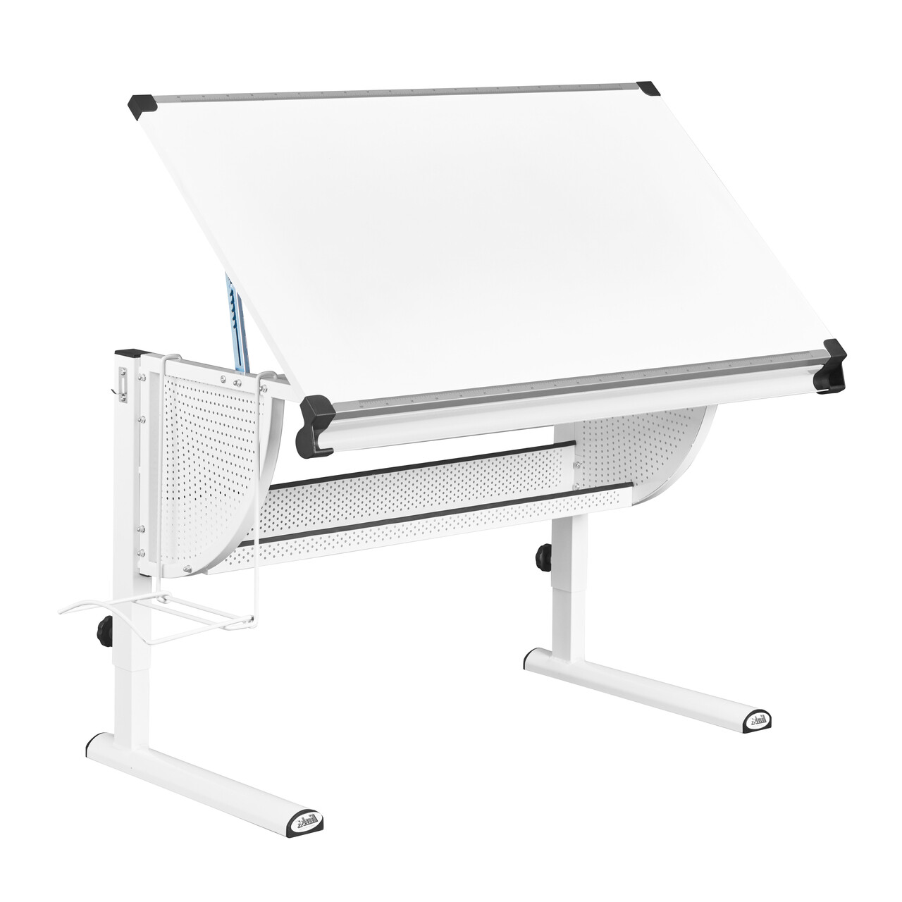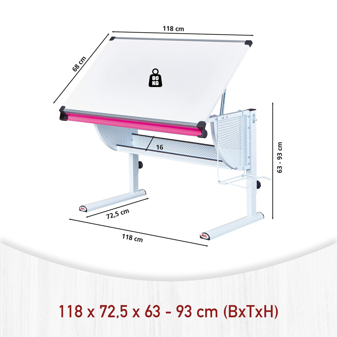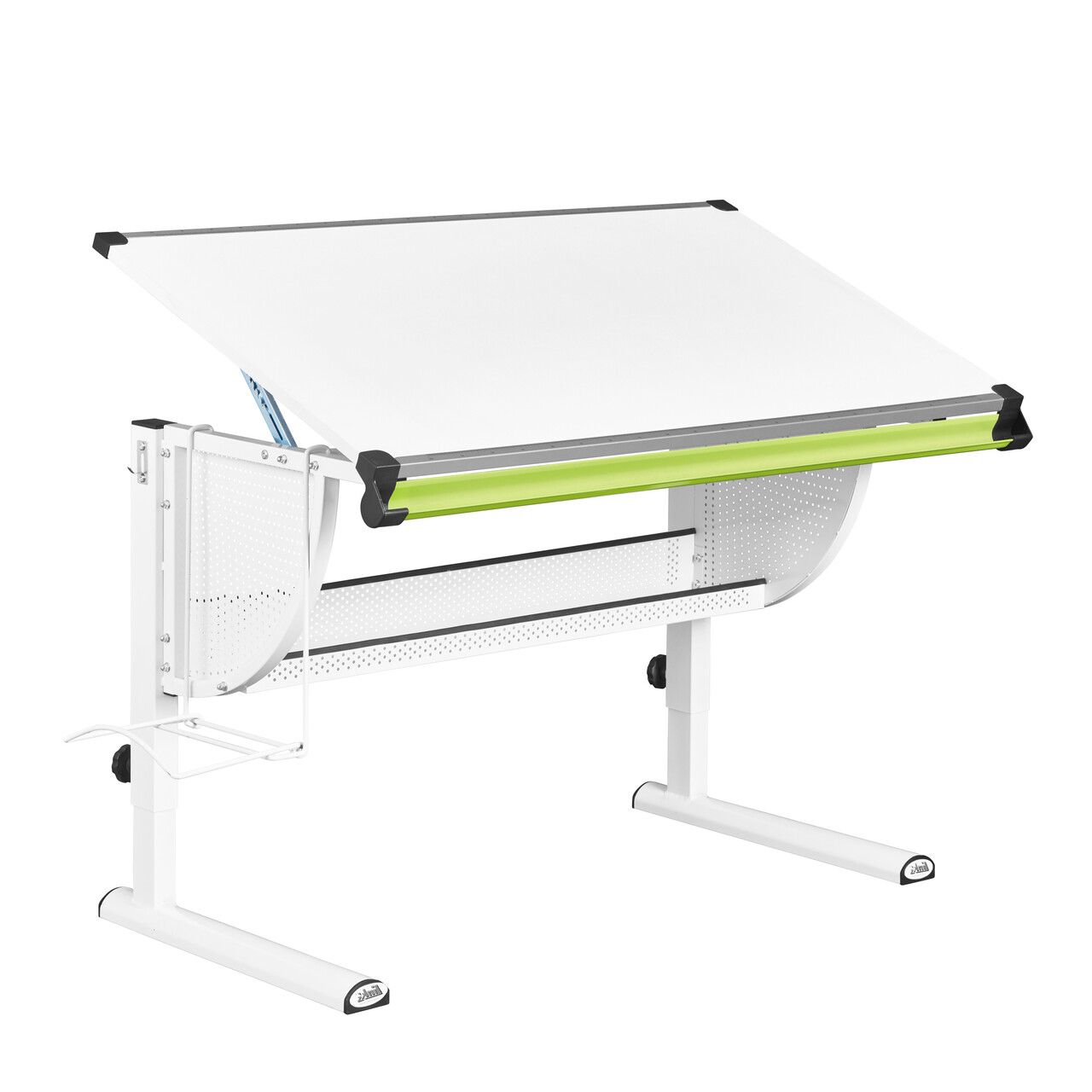 Biroul rabatabil si reglabil pe inaltime dispune de trei suporturi metalice interschimbabile pentru pixuri (alb, roz si verde), un opritor scalat (1-100 cm), un raft pentru ghiozdan care poate fi montat pe dreapta sau pe stanga, o banda magnetica si un raft pentru depozitare. Este fabricat dintr-un material durabil, rezistent la zgarieturi, usor de curatat si impermeabil.