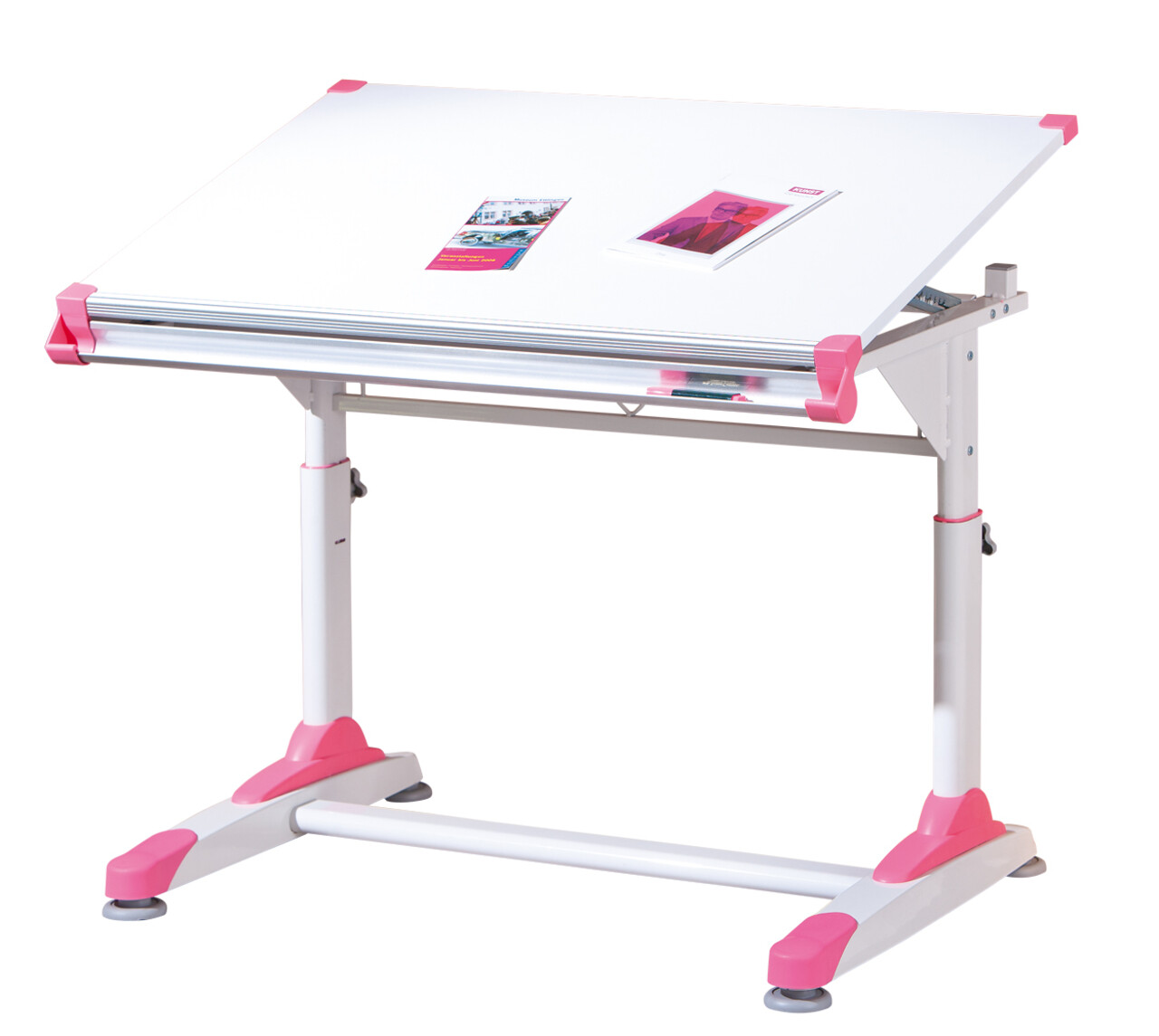 Birou reglabil pe inaltime, cu blat rabatabil si elemente interschimbabile (incluse pe roz si verde).