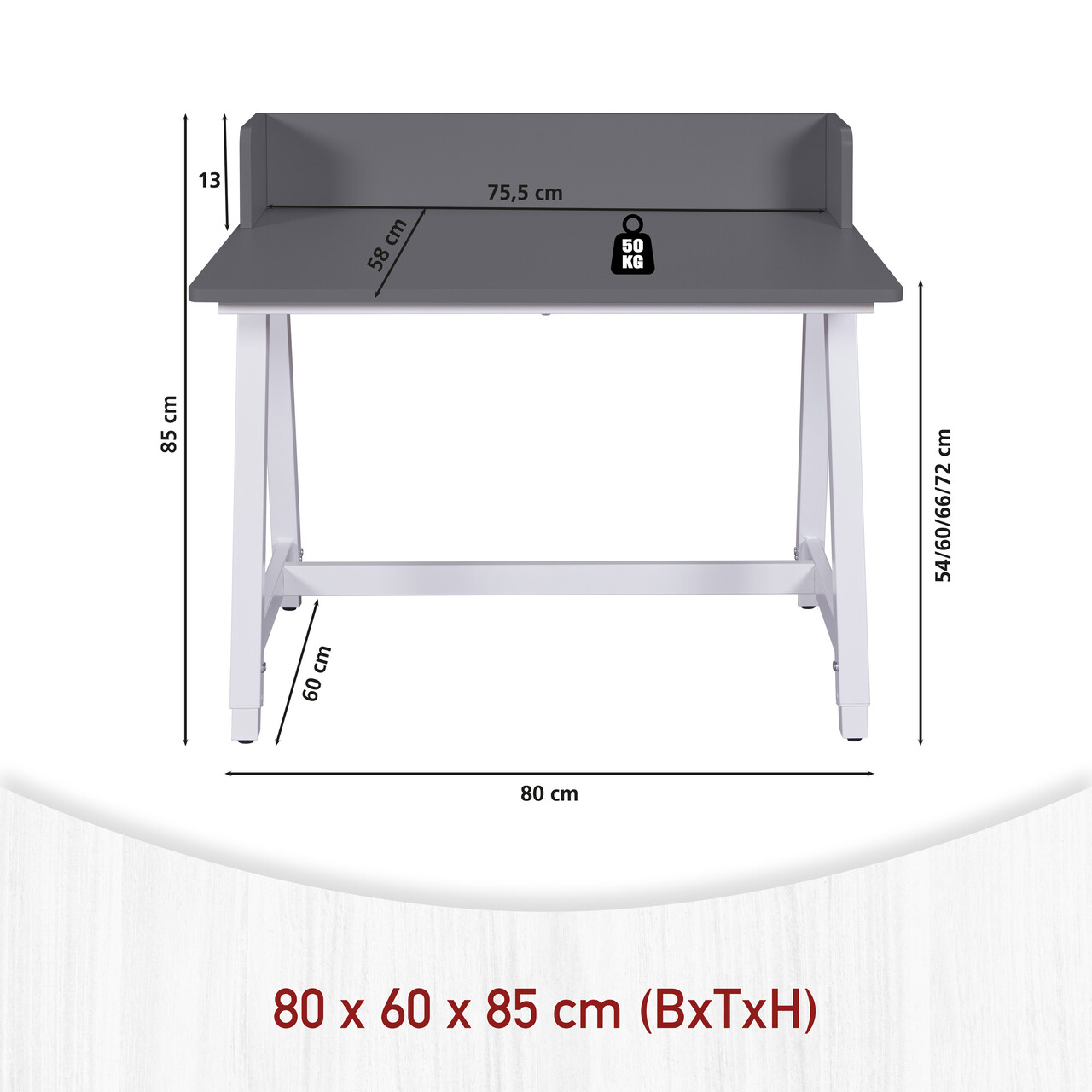 Biroul Emmelie este companionul perfect pentru micii exploratori si mintile creative! Cu designul sau modern in gri si alb, aduce accente de culoare atemporale in camera oricarui copil sau adolescent - toate acestea mentinand in acelasi timp functionalitatea completa. Fie ca este vorba de primele teme, proiecte de lucru manual sau citirea unor carti interesante - acest birou reglabil pe inaltime creste pur si simplu odata cu copilul dumneavoastra. Datorita celor cinci setari de inaltime reglabile (54/60/66/72/85 cm), biroul poate fi adaptat optim la inaltimea copilului, sustinand astfel o postura sanatoasa de la varsta prescolara pana la adolescenta. Blatul robust din MDF lacuit ofera mult spatiu pentru carti, ustensile de scris si idei creative. Raftul integrat asigura ca totul ramane la indemana si ordonat.