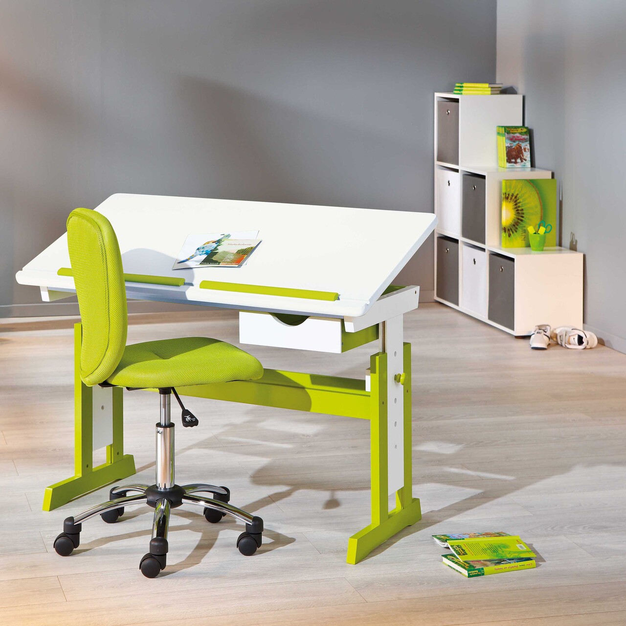 Birou pentru copii Pijii, Inter Link, 109x55x63-96 cm, lemn, alb/verde