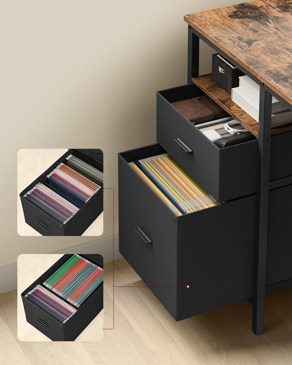 Constructie robusta: Fabricat din panouri solide din PAL si sustinut de un cadru metalic cu bara de rigidizare, biroul ofera stabilitate si durabilitate pe termen lung. Blatul suporta pana la 50 kg, iar fiecare raft poate sustine pana la 10 kg.