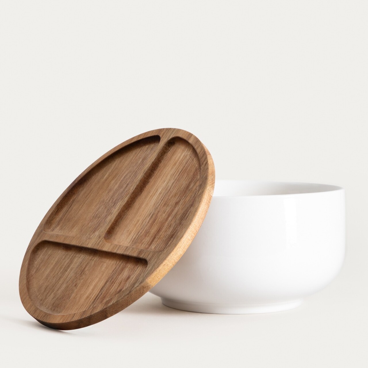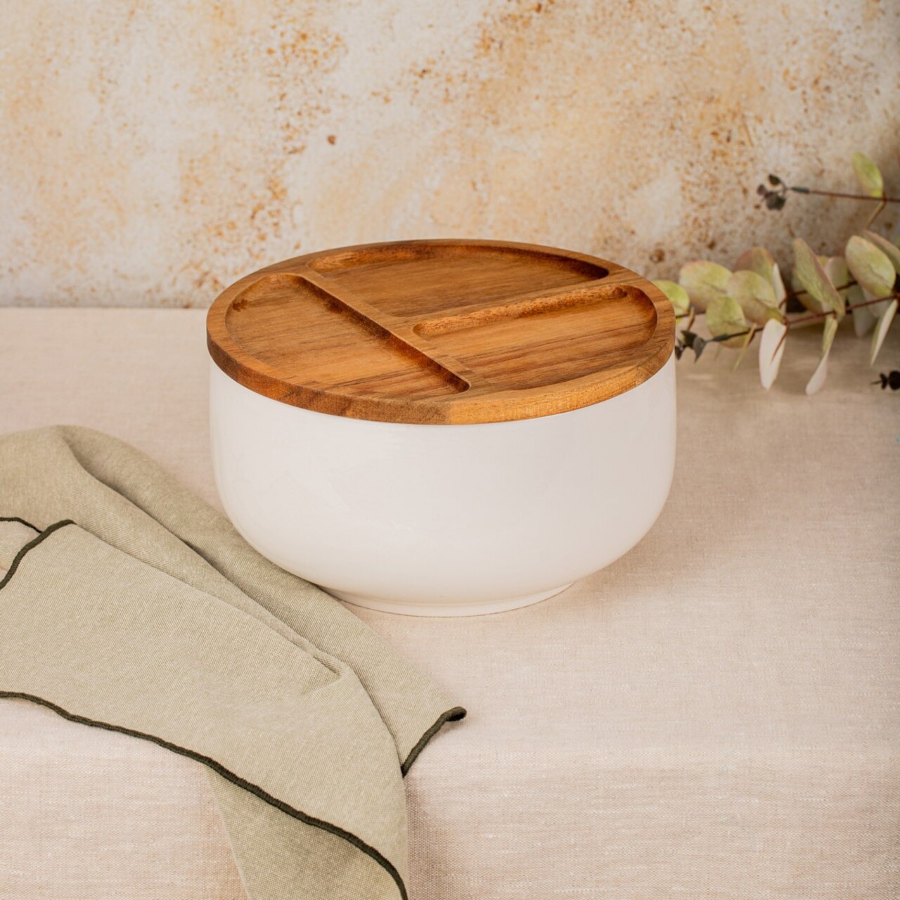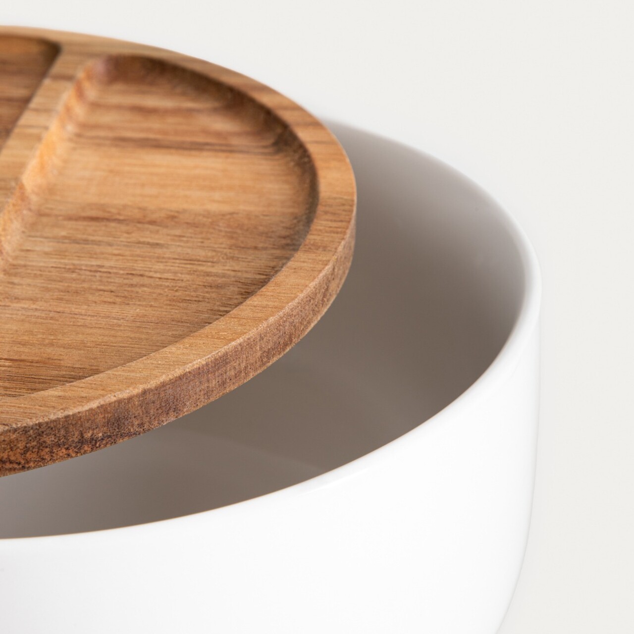 Bol cu capac Mooka, Homla, 24x13.5 cm, ceramica/lemn de salcam, alb/maro