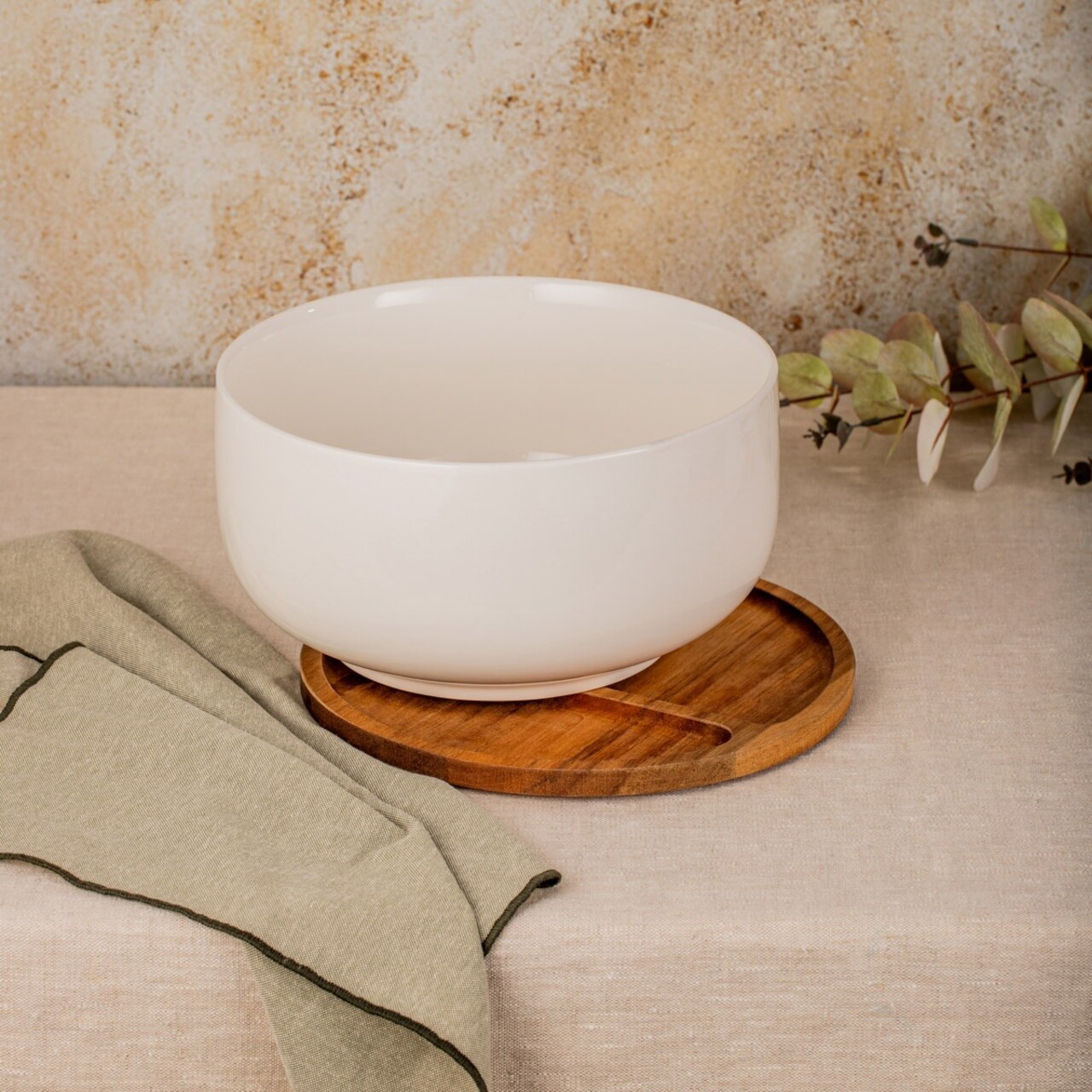 Bolul este fabricat din ceramica durabila, iar capacul este din lemn de salcam care este cunoscut pentru durabilitatea sa exceptionala si textura frumoasa.