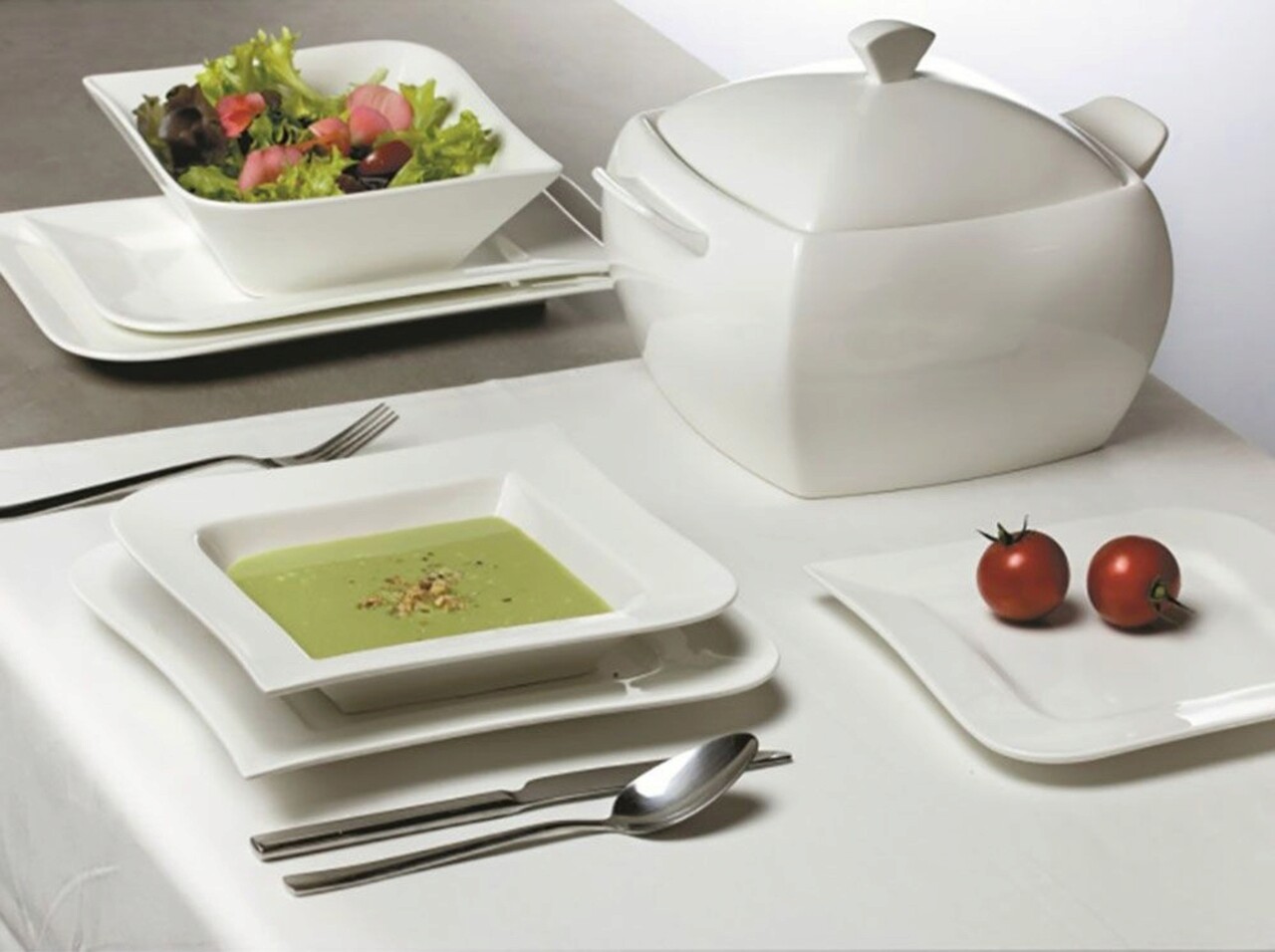 Bol pentru servire, din portelan alb de inalta calitate. Prezinta o forma interesanta, moderna, insa culoarea ii pastreaza eleganta si simplitatea. Se poate spala cu usurinta in masina de spalat vase si poate fi folosit in cuptorul cu microunde.